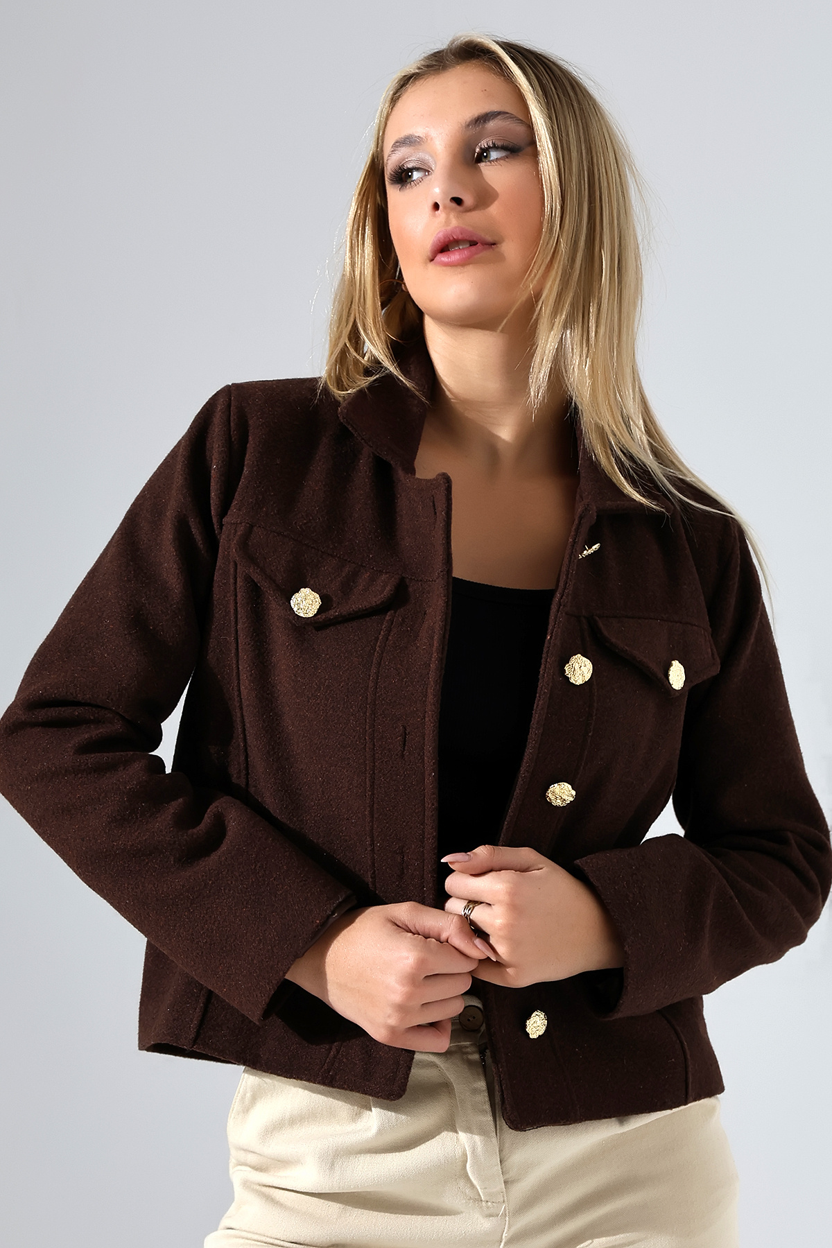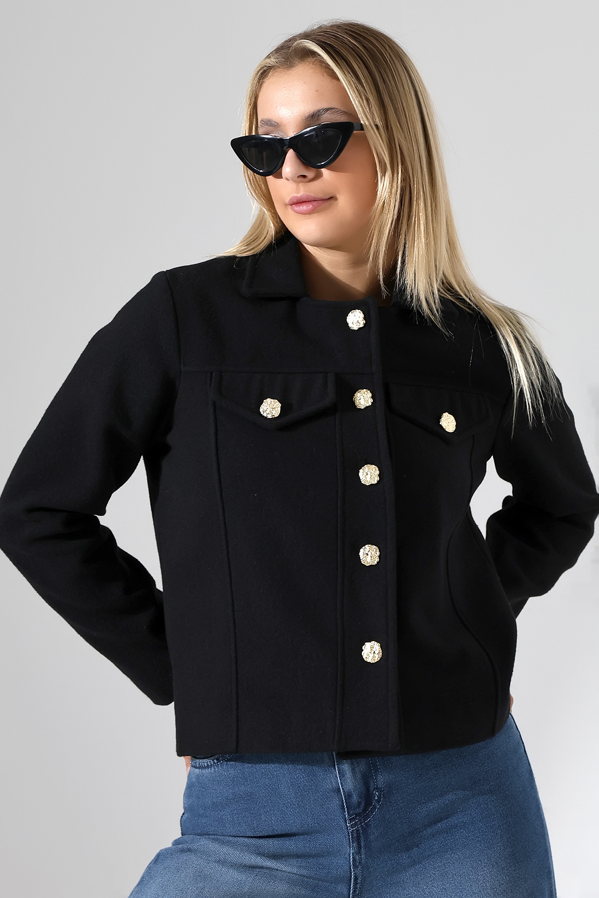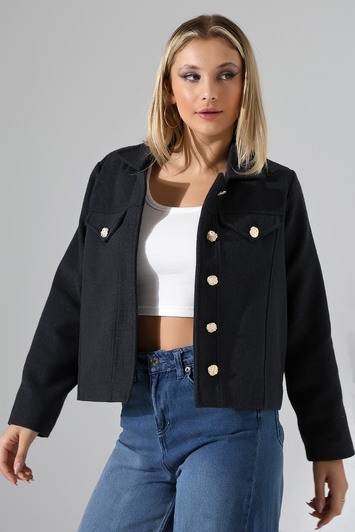 Düğmeli Lacivert Kadın Kısa Kaşe Ceket Düğmeli Lacivert Kadın Kısa Kaşe Ceket UJ1025 XL