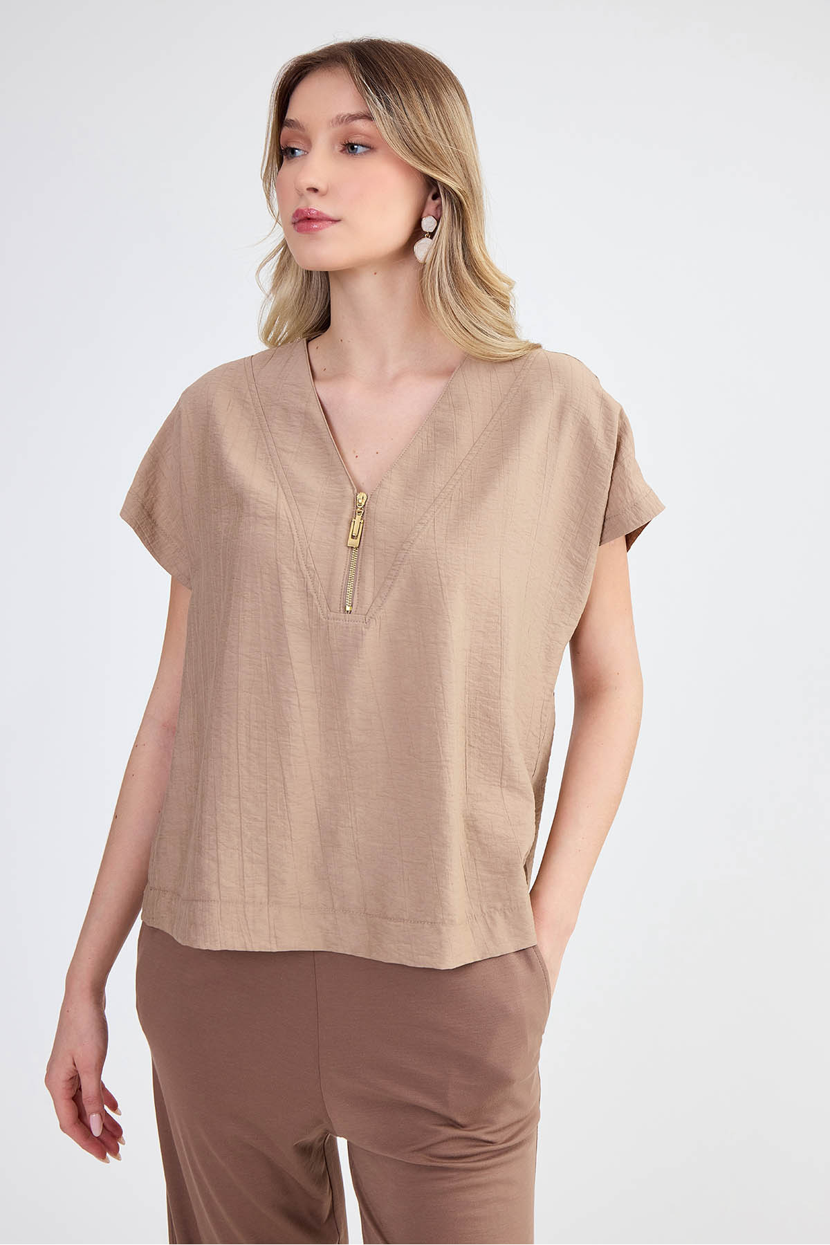 Krinkıl Kumaş Önü Fermuarlı Kısa Kol Bluz Krinkıl Kumaş Önü Fermuarlı Kısa Kol Bluz 24-3772 XL