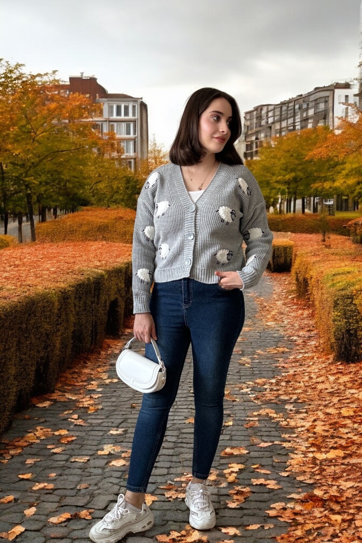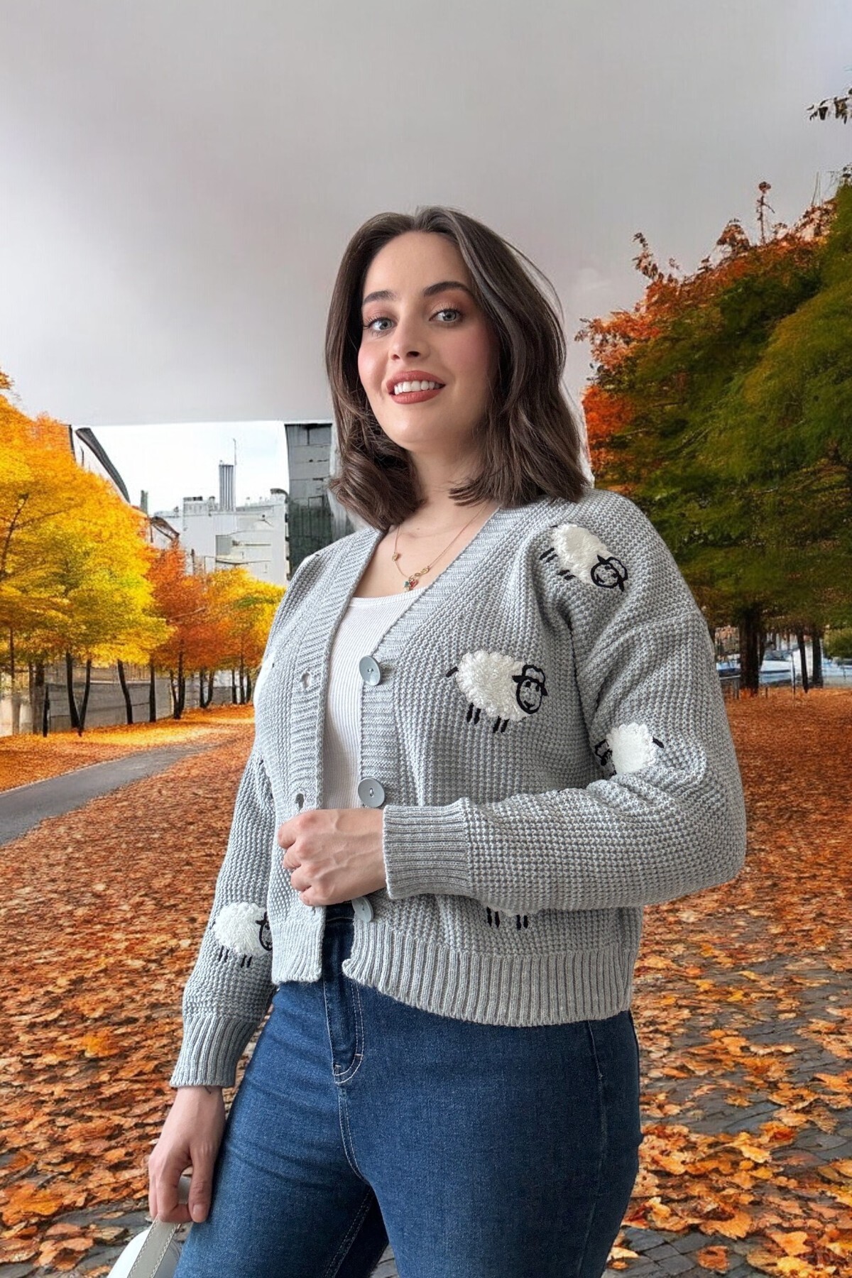 E0088 Kuzu Nakışlı Düğmeli Triko Hırka - Gri E0088 Kuzu Nakışlı Düğmeli Triko Hırka - Gri Standart