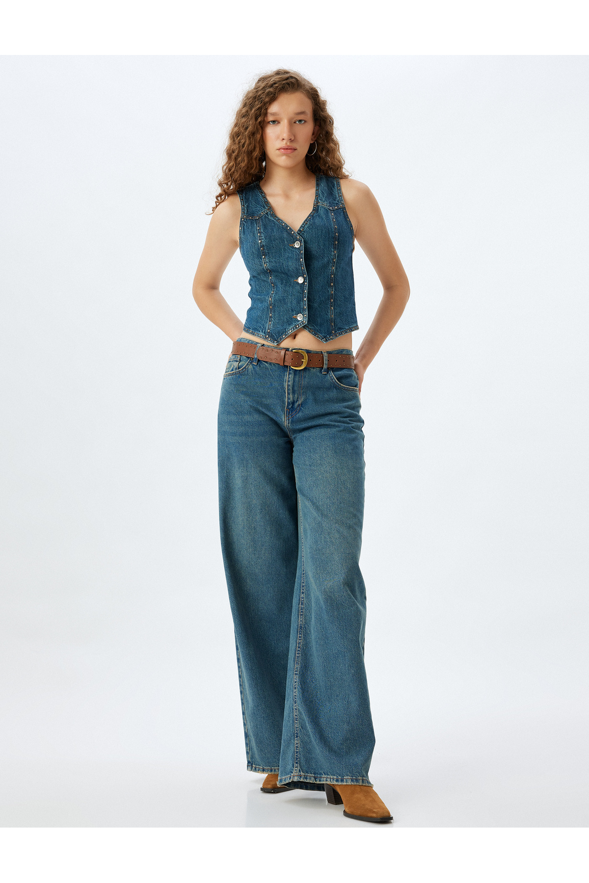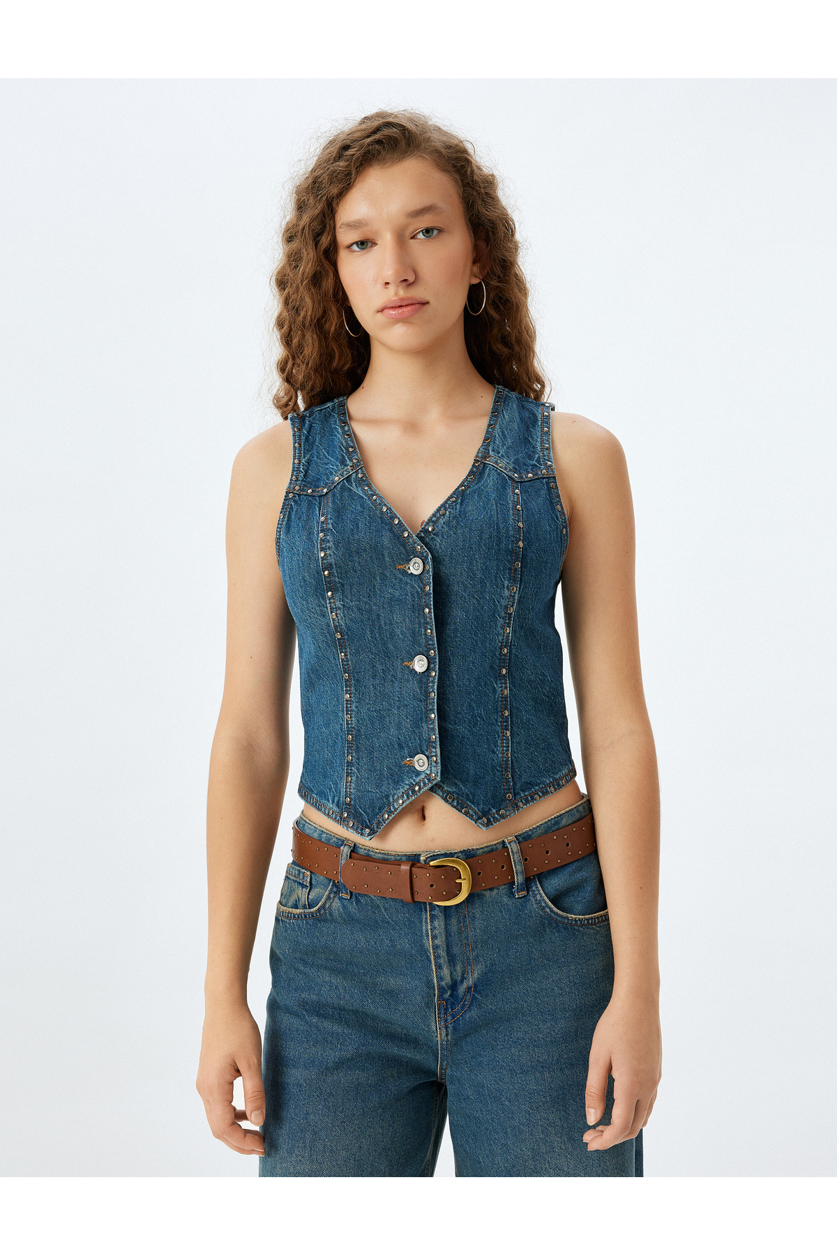 V Yaka Taşlı Düğmeli Kolsuz Slim Fit Kot Yelek V Yaka Taşlı Düğmeli Kolsuz Slim Fit Kot Yelek 5WAL20006MD 42