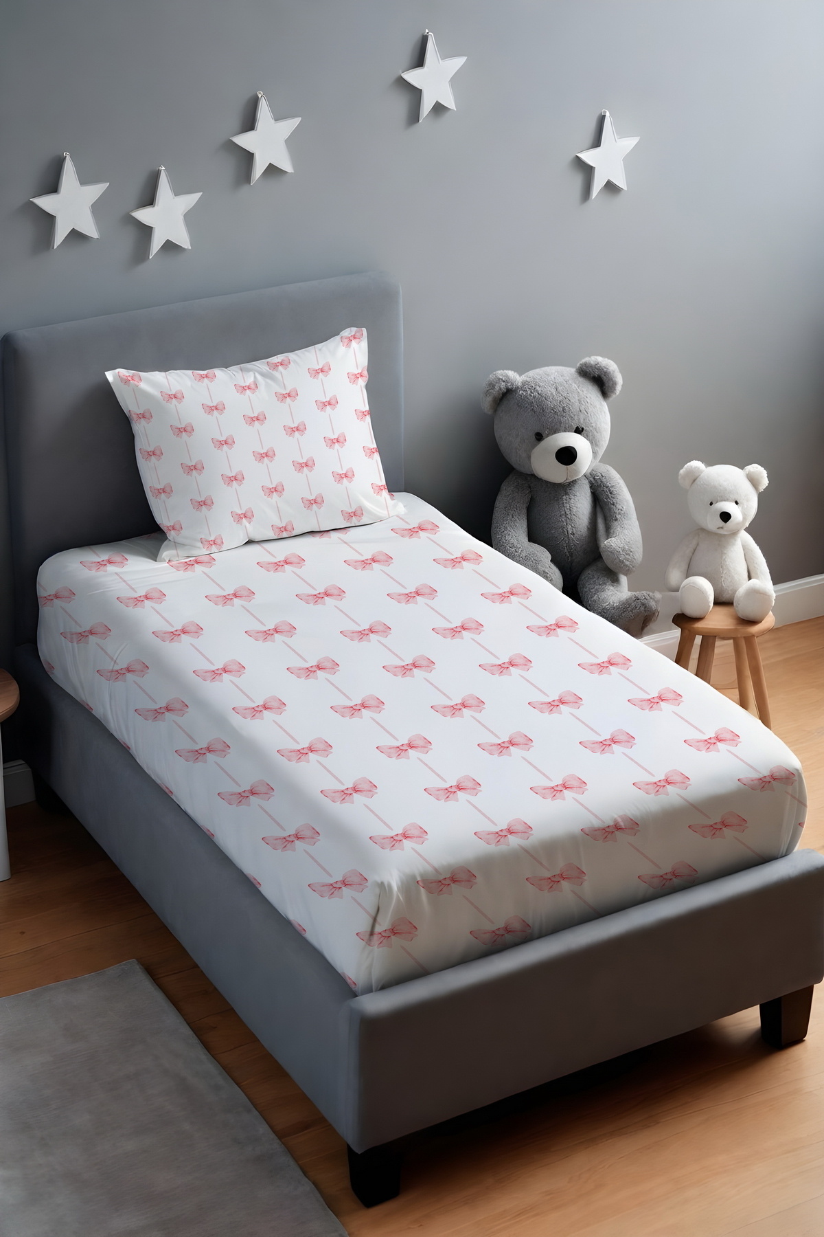 Pembe Şeritli Fiyonk Desenli Yatak Örtüsü ve Yastık Kılıfı Pembe Şeritli Fiyonk Desenli Yatak Örtüsü ve Yastık Kılıfı evortu2340 تک سایز