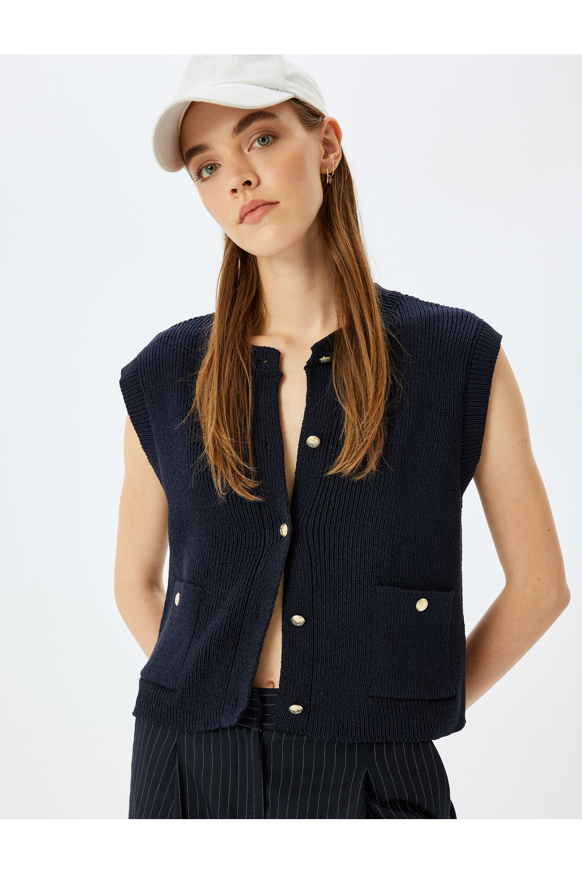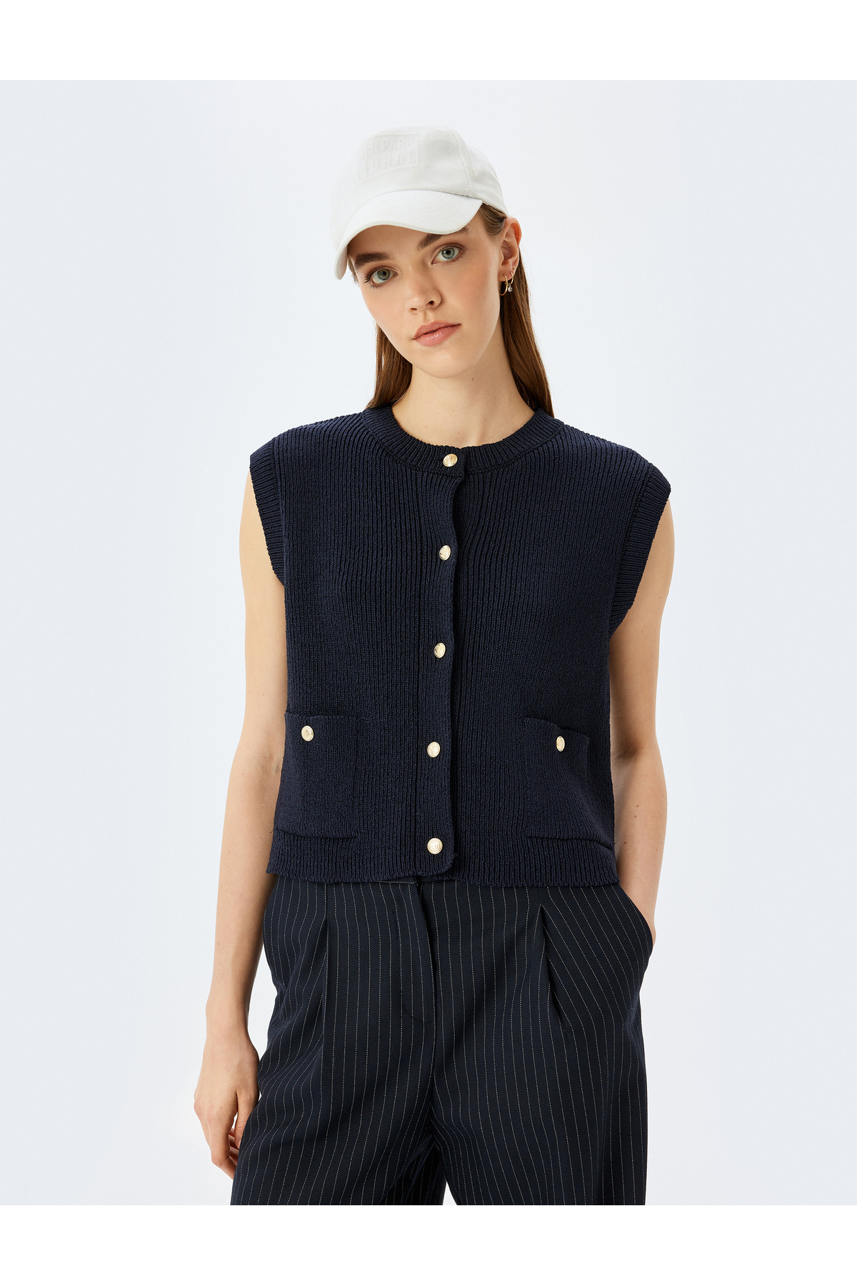 Düğmeli Cep Detaylı Bisiklet Yaka Kolsuz Triko Yelek Düğmeli Cep Detaylı Bisiklet Yaka Kolsuz Triko Yelek 5WAL20028HT L