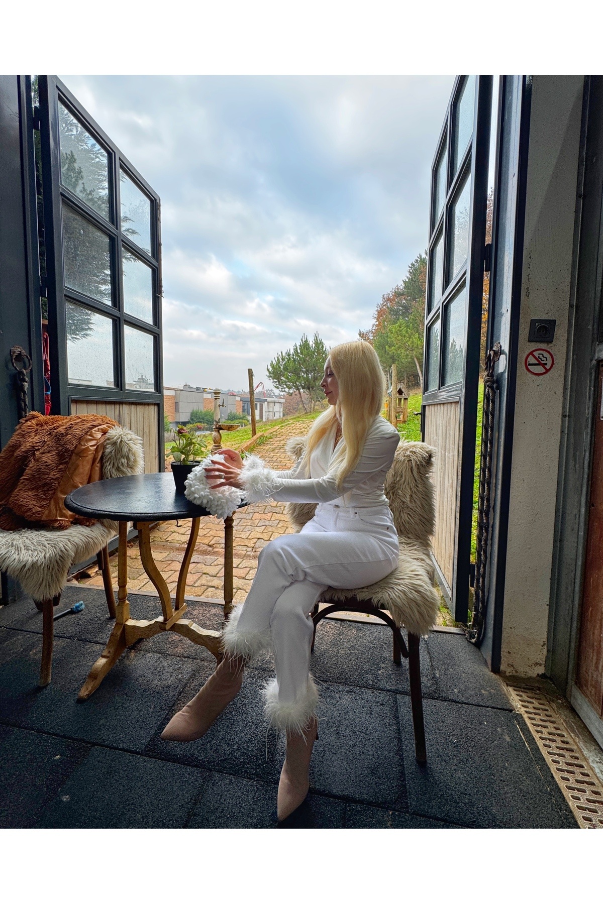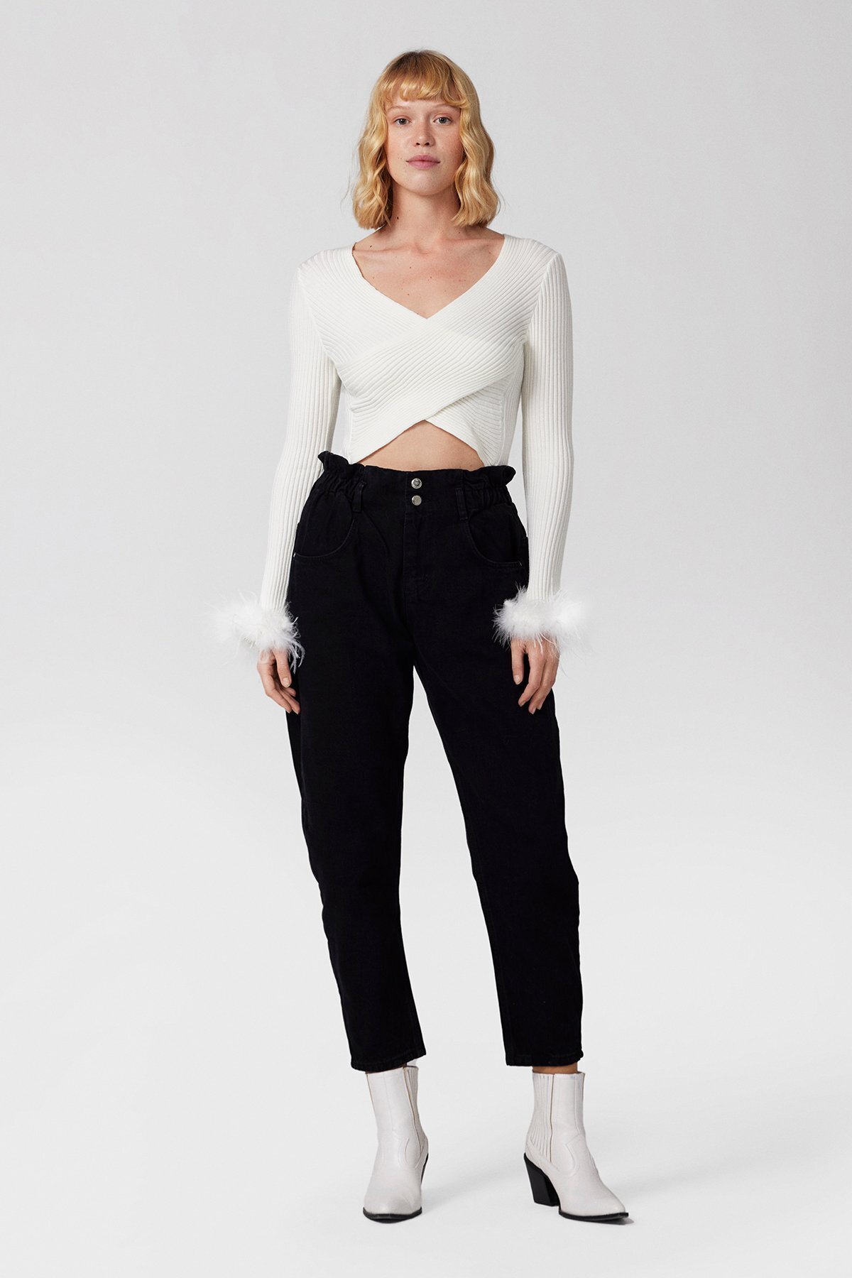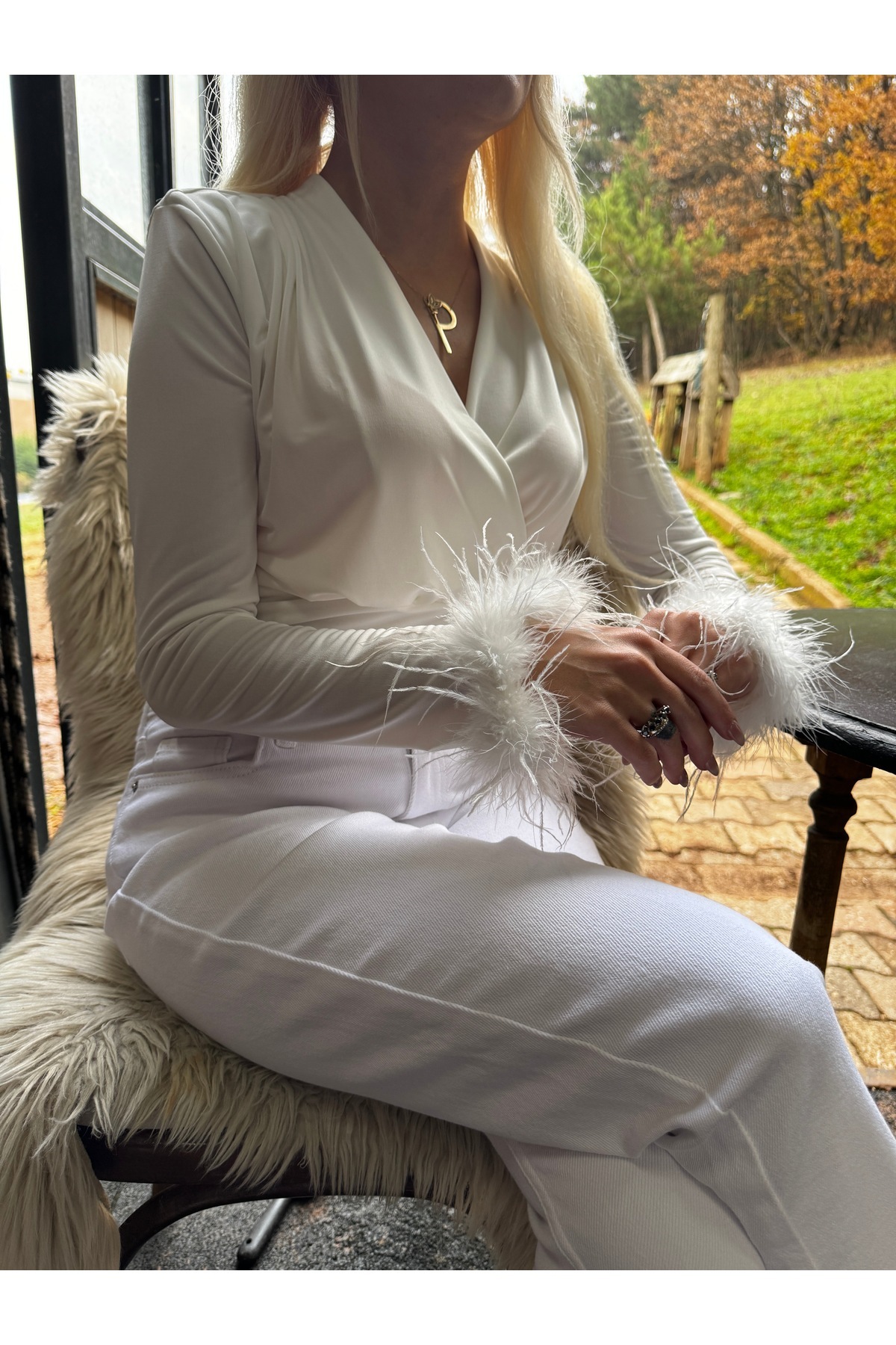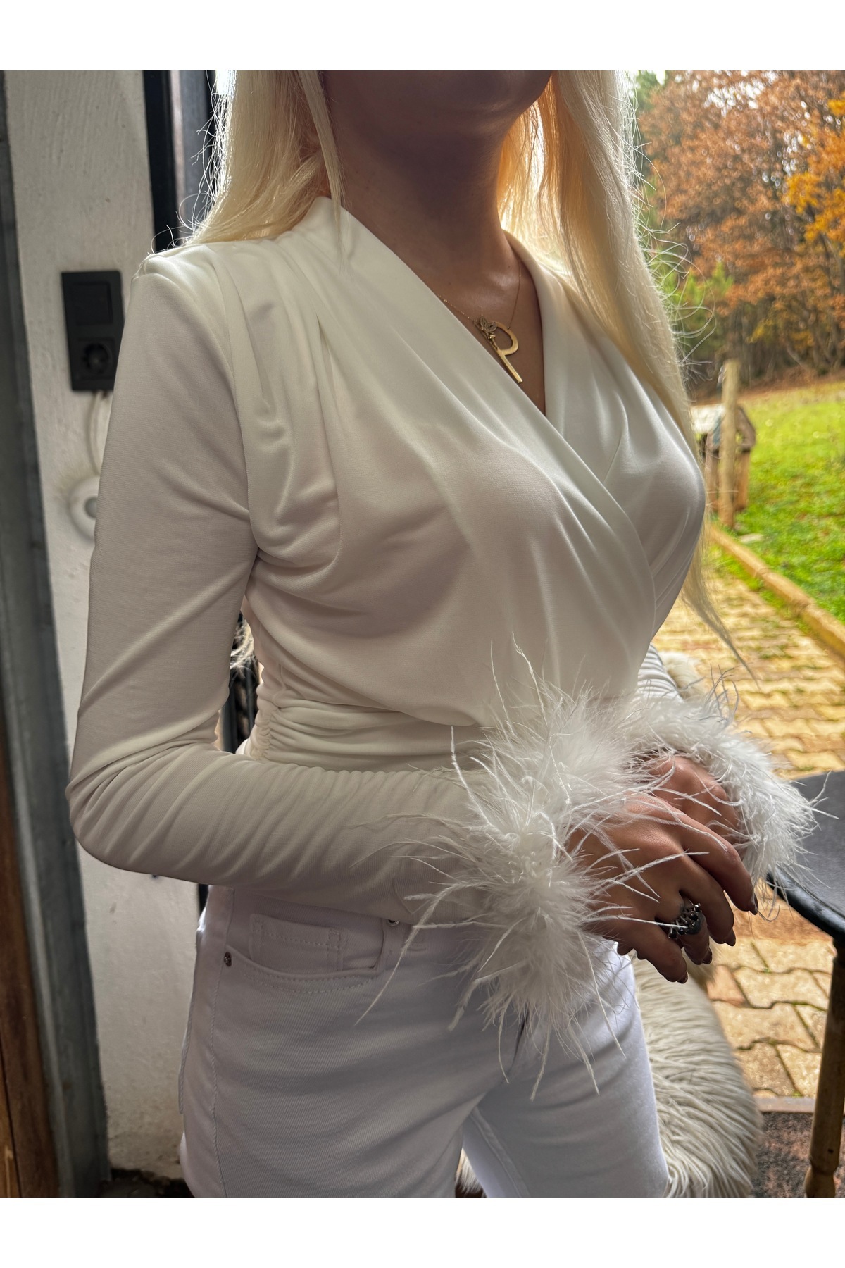 Malibu Tüy Detaylı Kolları tüylü Dekolte Beyaz Bluz Otriş bluz kruvaze yaka Malibu Tüy Detaylı Kolları tüylü Dekolte Beyaz Bluz Otriş bluz kruvaze yaka B6391 L