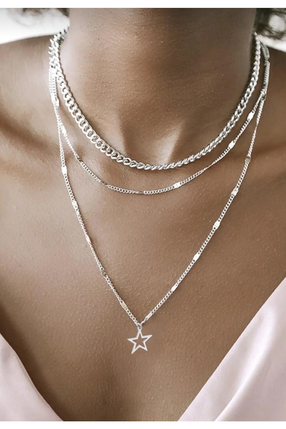 Gümüş Renk Zincirli Yıldız Detaylı Üçlü Sallantılı Çoklu Kolye Gümüş Renk Zincirli Yıldız Detaylı Üçlü Sallantılı Çoklu Kolye 3SWS334 تک سایز
