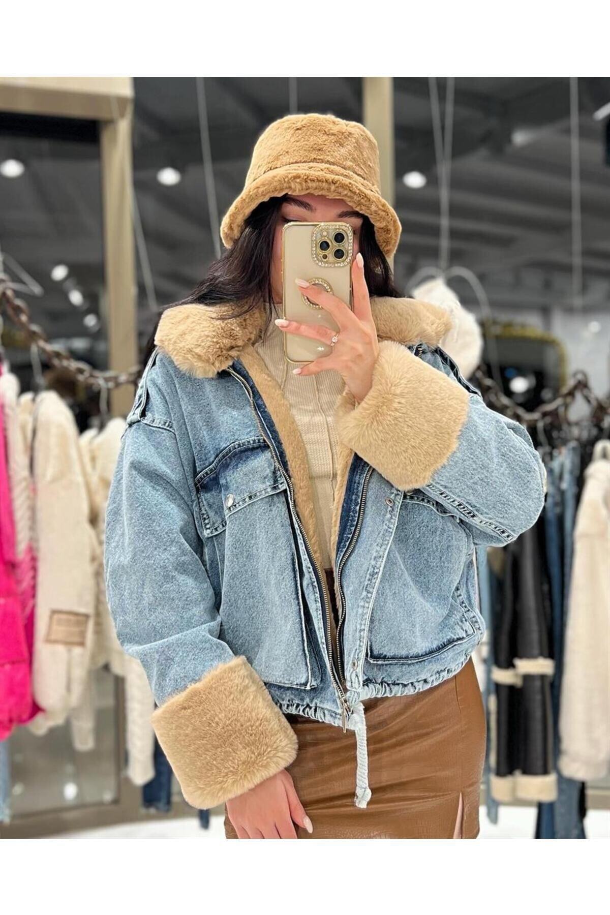 Kadın Kürklü Cep Detay Denim Mont Kadın Kürklü Cep Detay Denim Mont kakürkcepdetdenmont Standart
