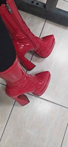 Marko Kadın Kırmızı Streç Rugan Çift Platform Özel Tasarım Topuklu Bot Marko Kadın Kırmızı Streç Rugan Çift Platform Özel Tasarım Topuklu Bot FS938 40