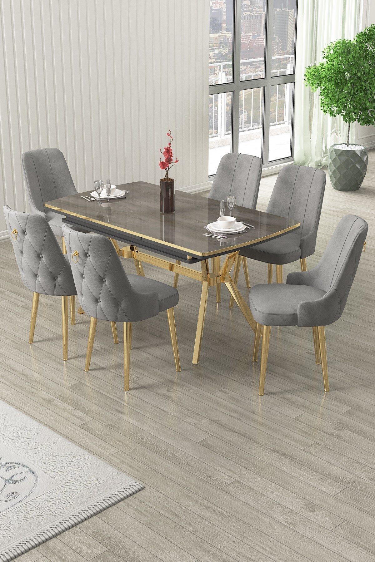 Asel Serisi 90x160 Lak Panel Antrasit İroni Gold Kaplama Ayaklı Masa Takımı ve 6 Antrasit Sandalye Asel Serisi 90x160 Lak Panel Antrasit İroni Gold Kaplama Ayaklı Masa Takımı ve 6 Antrasit Sandalye 22ASELANTİ06GLD06 تک سایز
