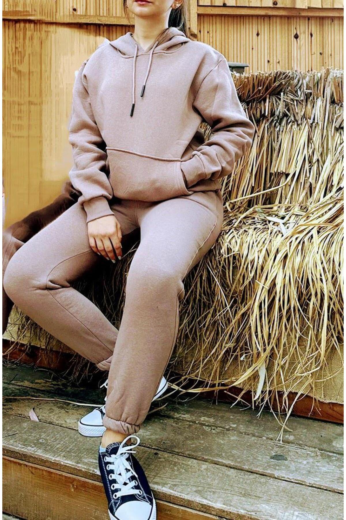 Kadın Üç Iplik Kanguru Cepli Kapüşonlu Içi Pamuklu Yumuşacık Oversize Eşofman Takımı Kadın Üç Iplik Kanguru Cepli Kapüşonlu Içi Pamuklu Yumuşacık Oversize Eşofman Takımı 3İPŞET-KAP001-K 2XL