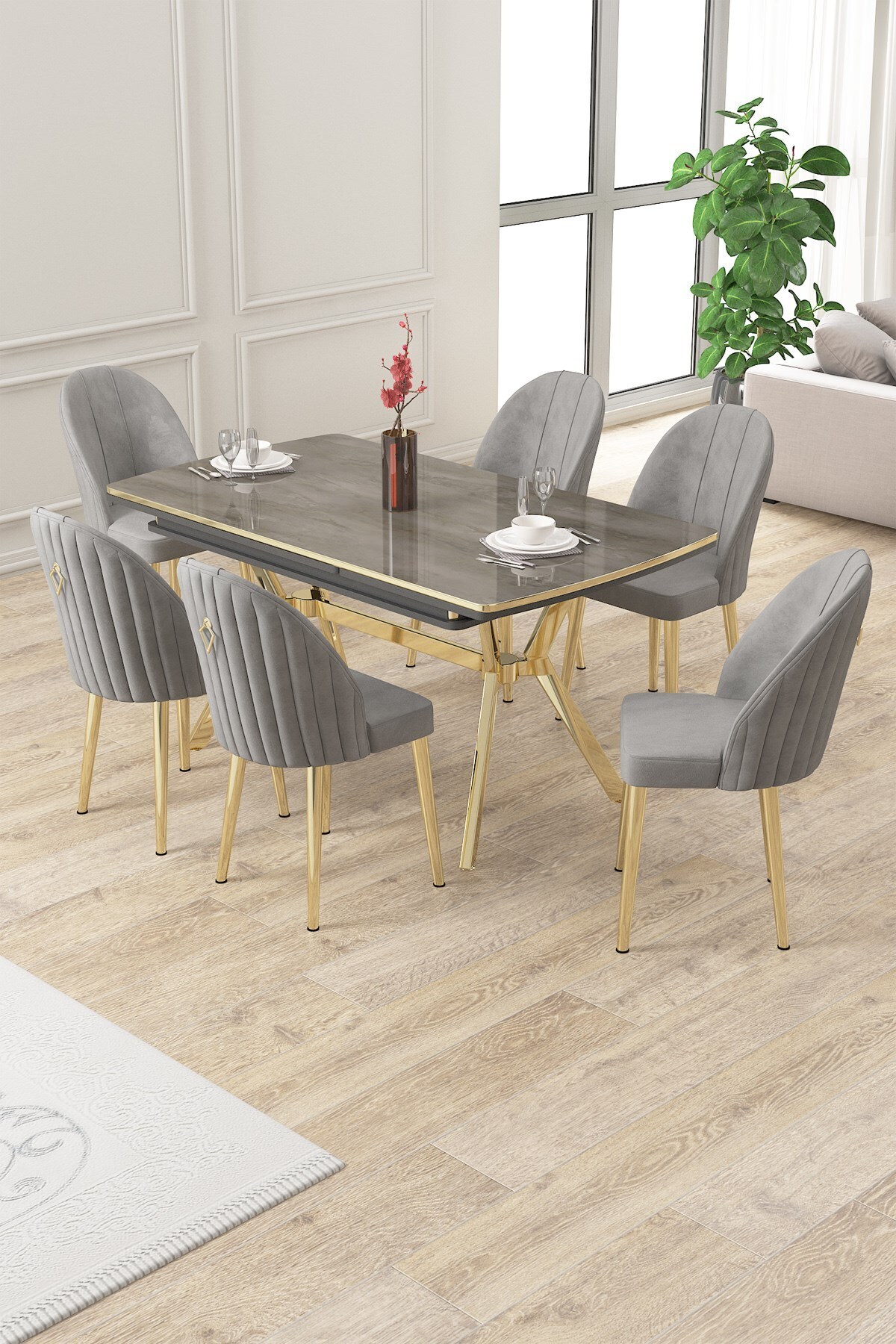 Esla Serisi 90x160 Lak Panel Beyaz Mermer Desen Gold Ayaklı Masa Takımı ve 6 Cappucino Sandalye Esla Serisi 90x160 Lak Panel Beyaz Mermer Desen Gold Ayaklı Masa Takımı ve 6 Cappucino Sandalye 22ESLA06BMR06GLD تک سایز