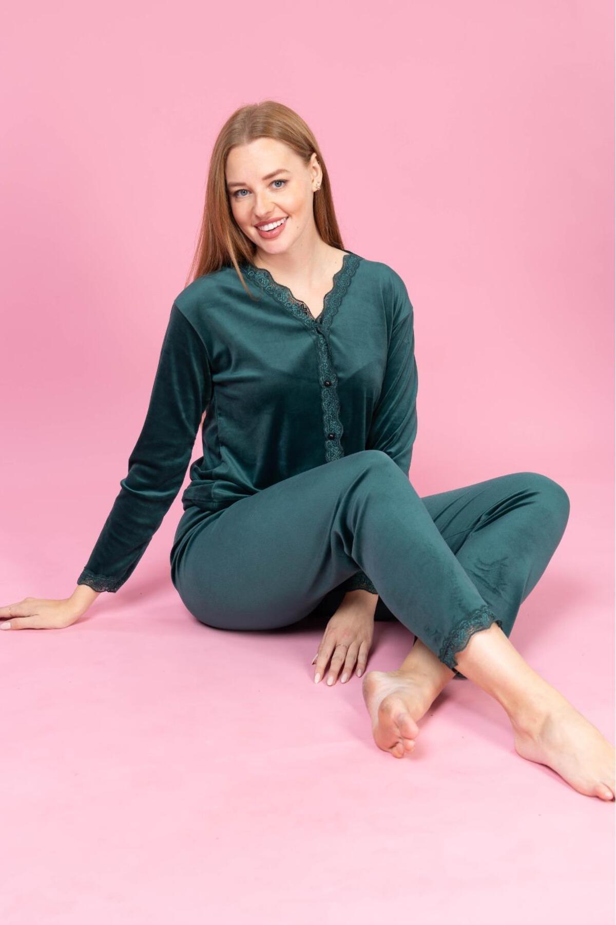 Kadın Önden Düğmeli Kadife Dantel Yaka Detaylı, Çeyizlik Petrol Yeşili Pijama Takımı Gn-255 Kadın Önden Düğmeli Kadife Dantel Yaka Detaylı, Çeyizlik Petrol Yeşili Pijama Takımı Gn-255 GN-255 2XL
