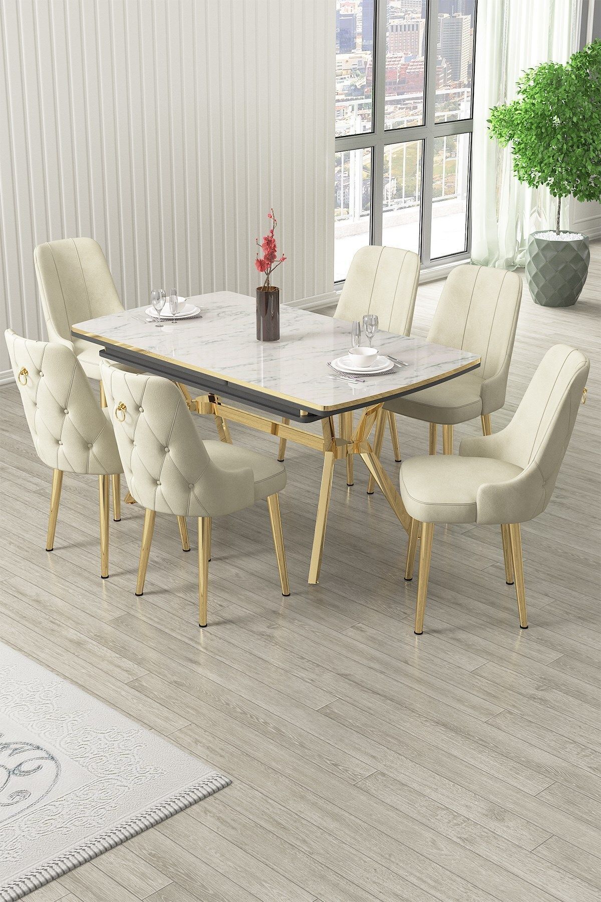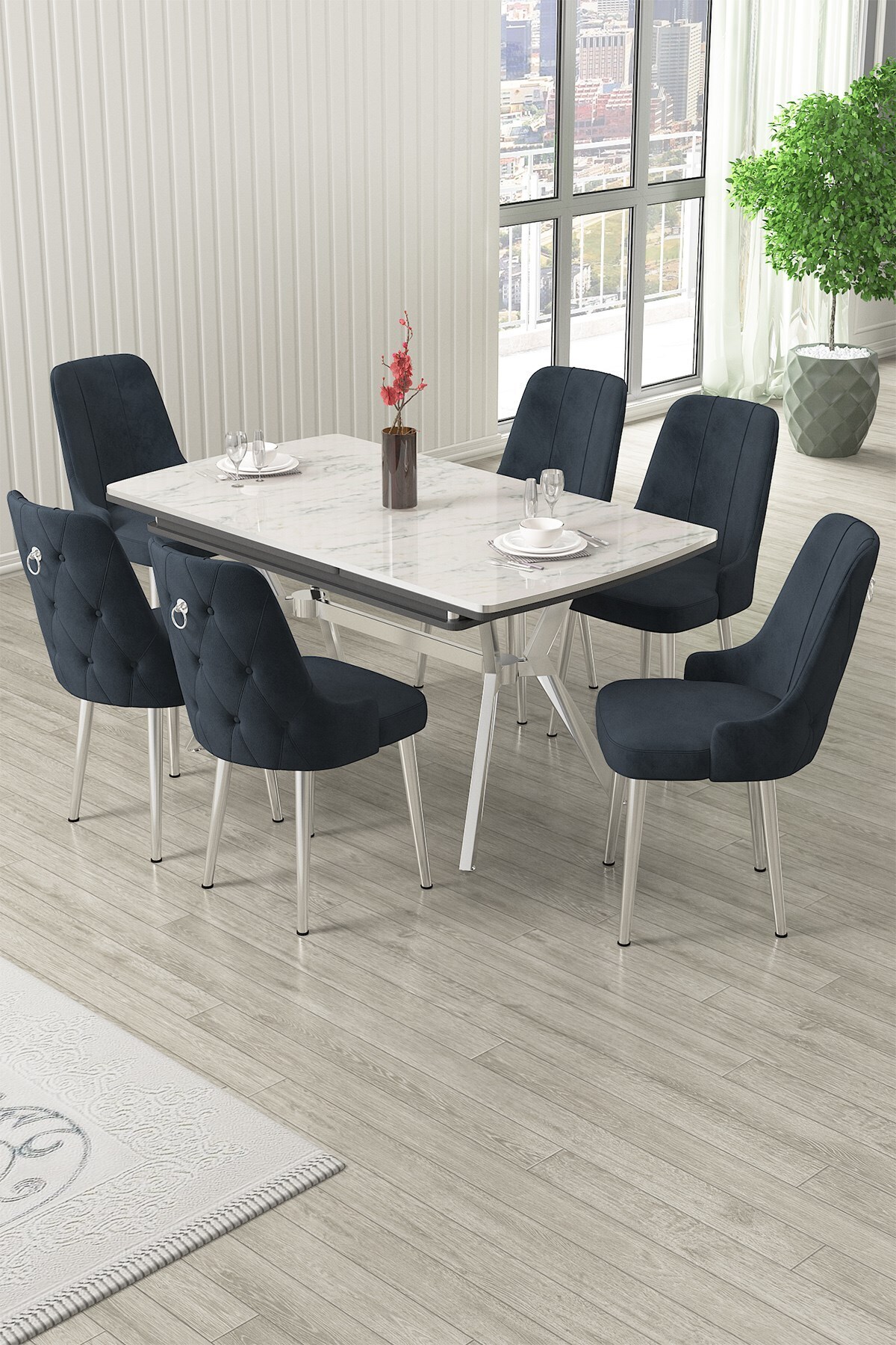 Nis Serisi 89x150 Açılabilir Lak Panel Beyaz Mermer Krom Ayak Masa Takımı ve 6 Gri Sandalye Nis Serisi 89x150 Açılabilir Lak Panel Beyaz Mermer Krom Ayak Masa Takımı ve 6 Gri Sandalye 22NİS06BMRGLD06 تک سایز