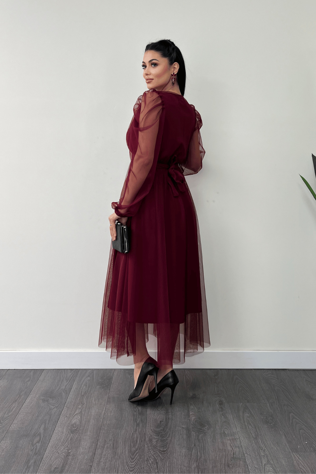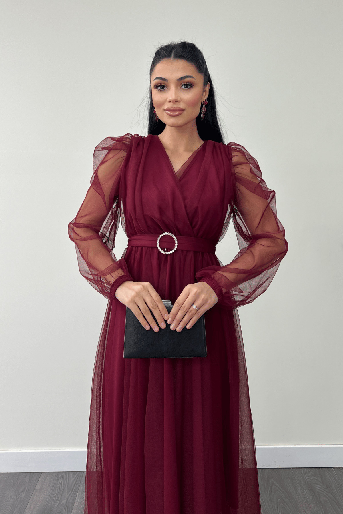 Tül Kumaş Kruvaze Yaka Taş Kemer Detaylı Elbise - BORDO Tül Kumaş Kruvaze Yaka Taş Kemer Detaylı Elbise - BORDO GYM-02195 46