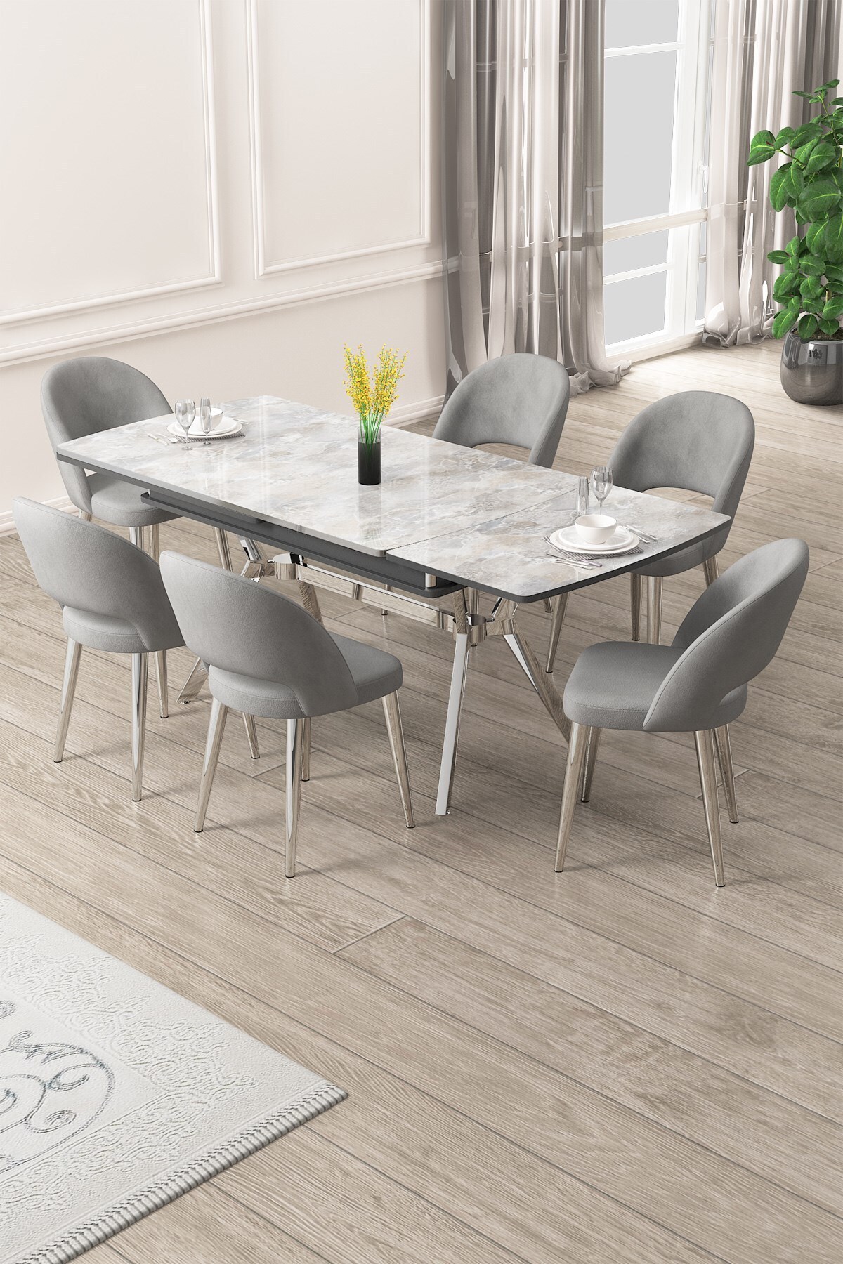 Weps Serisi 89x150 Açılabilir Lak Panel Rampla Gri Krom Ayak Masa Takımı ve 6 Gri Sandalye Weps Serisi 89x150 Açılabilir Lak Panel Rampla Gri Krom Ayak Masa Takımı ve 6 Gri Sandalye 22WEPS06RMPKRM06 تک سایز