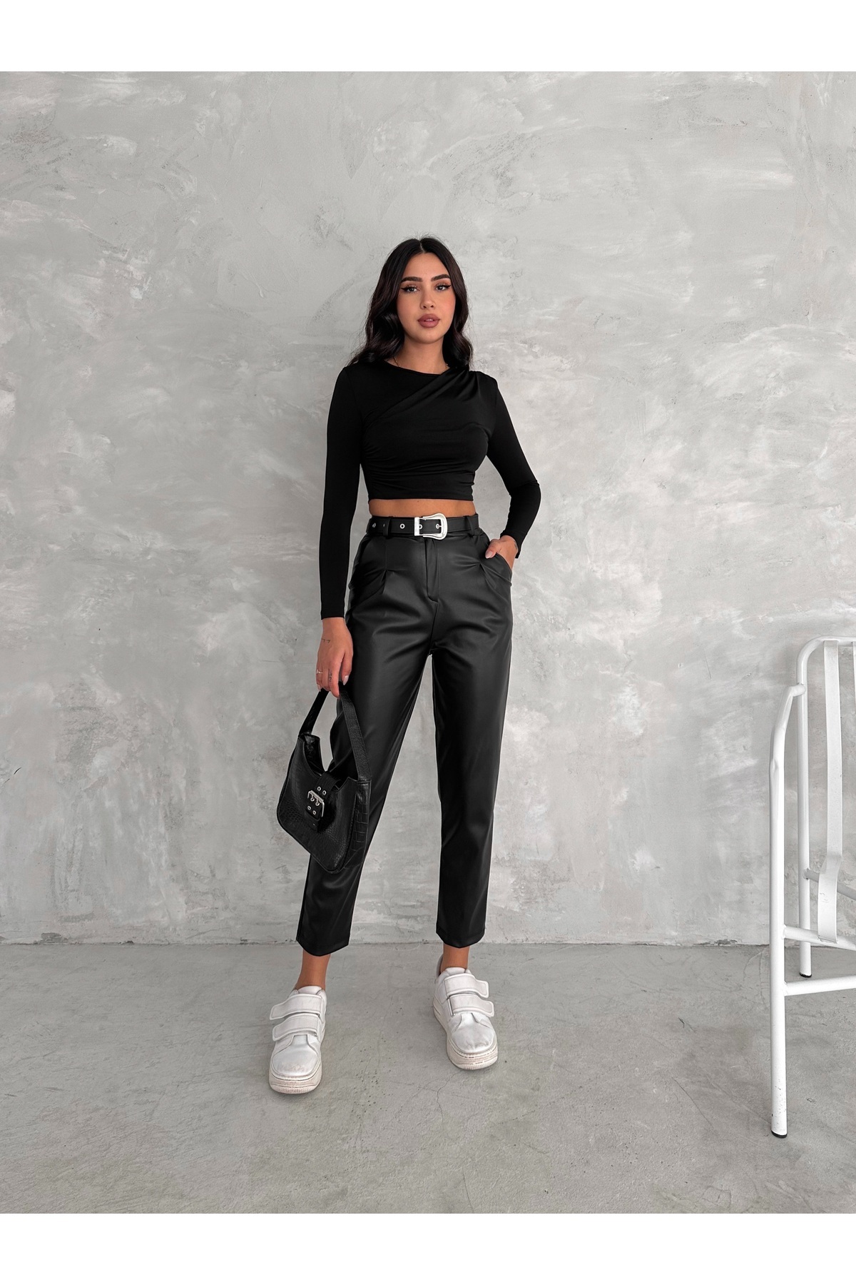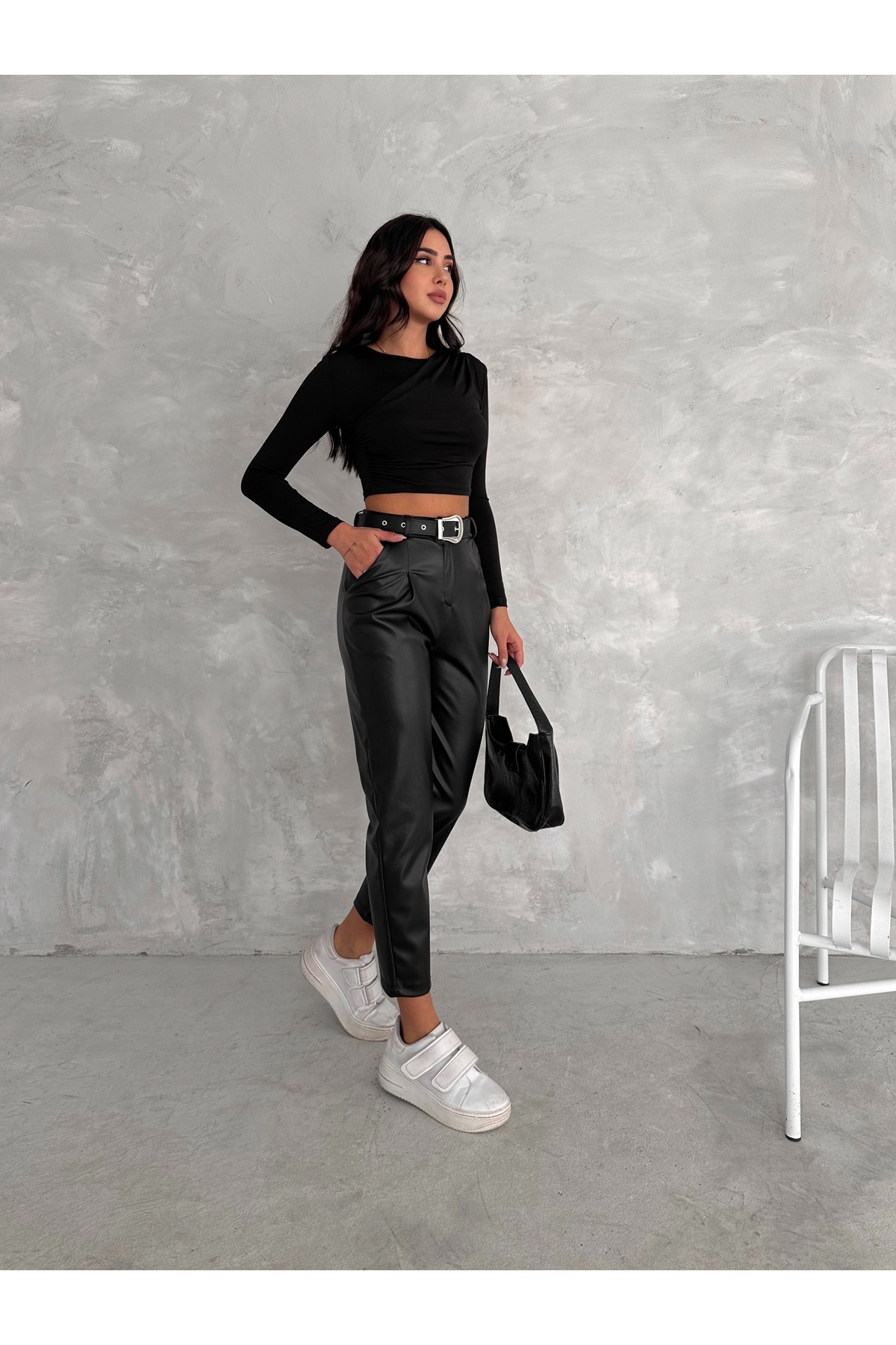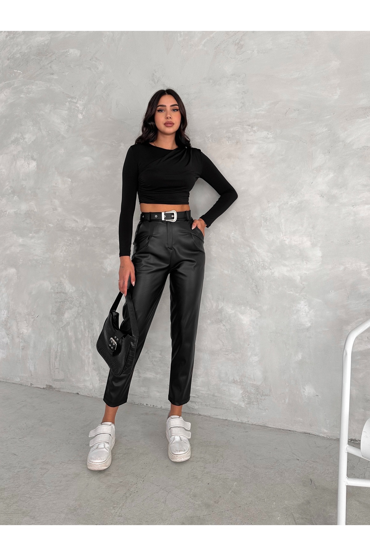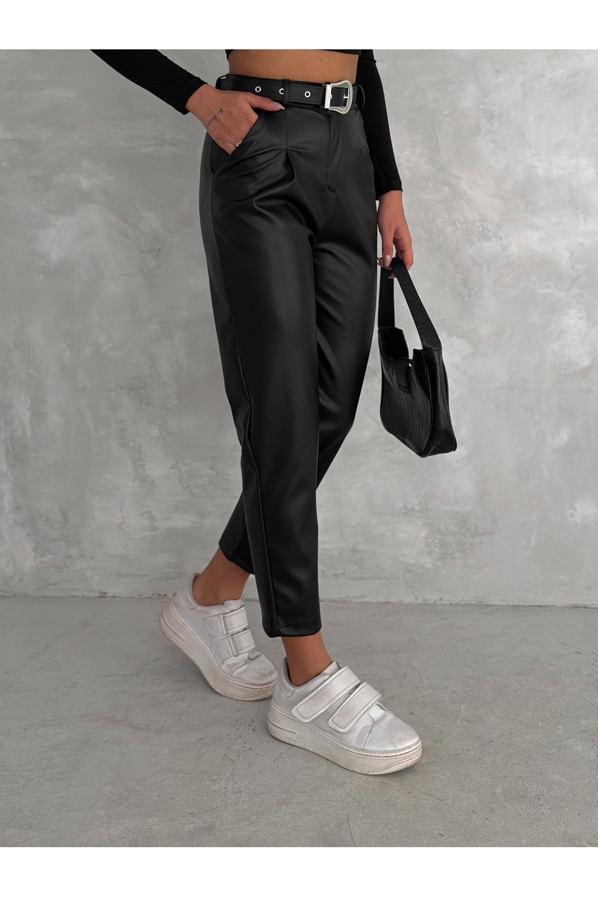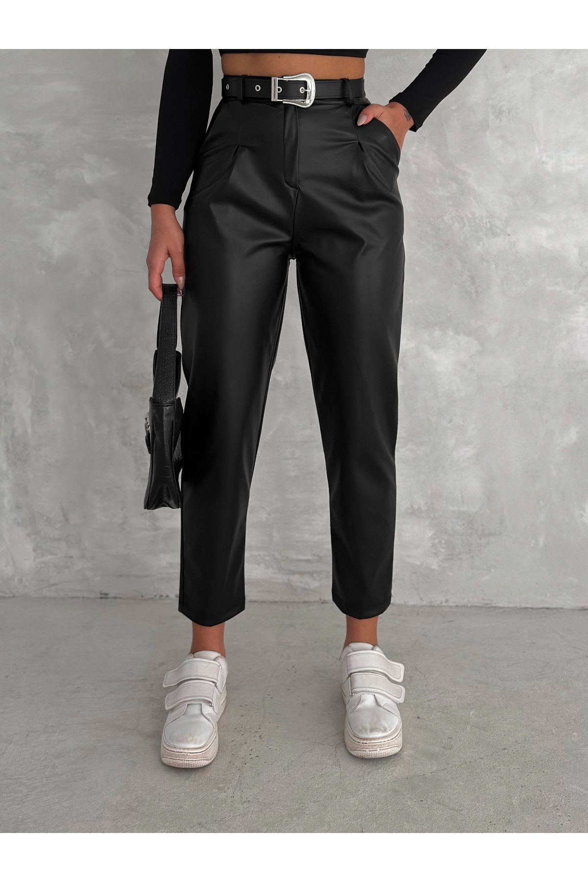 Kadın Yüksek Bel Maskülen Klasik Deri Pantolon Kemer Detaylı Havuç Model Kadın Yüksek Bel Maskülen Klasik Deri Pantolon Kemer Detaylı Havuç Model WİNPNKMR01 XL