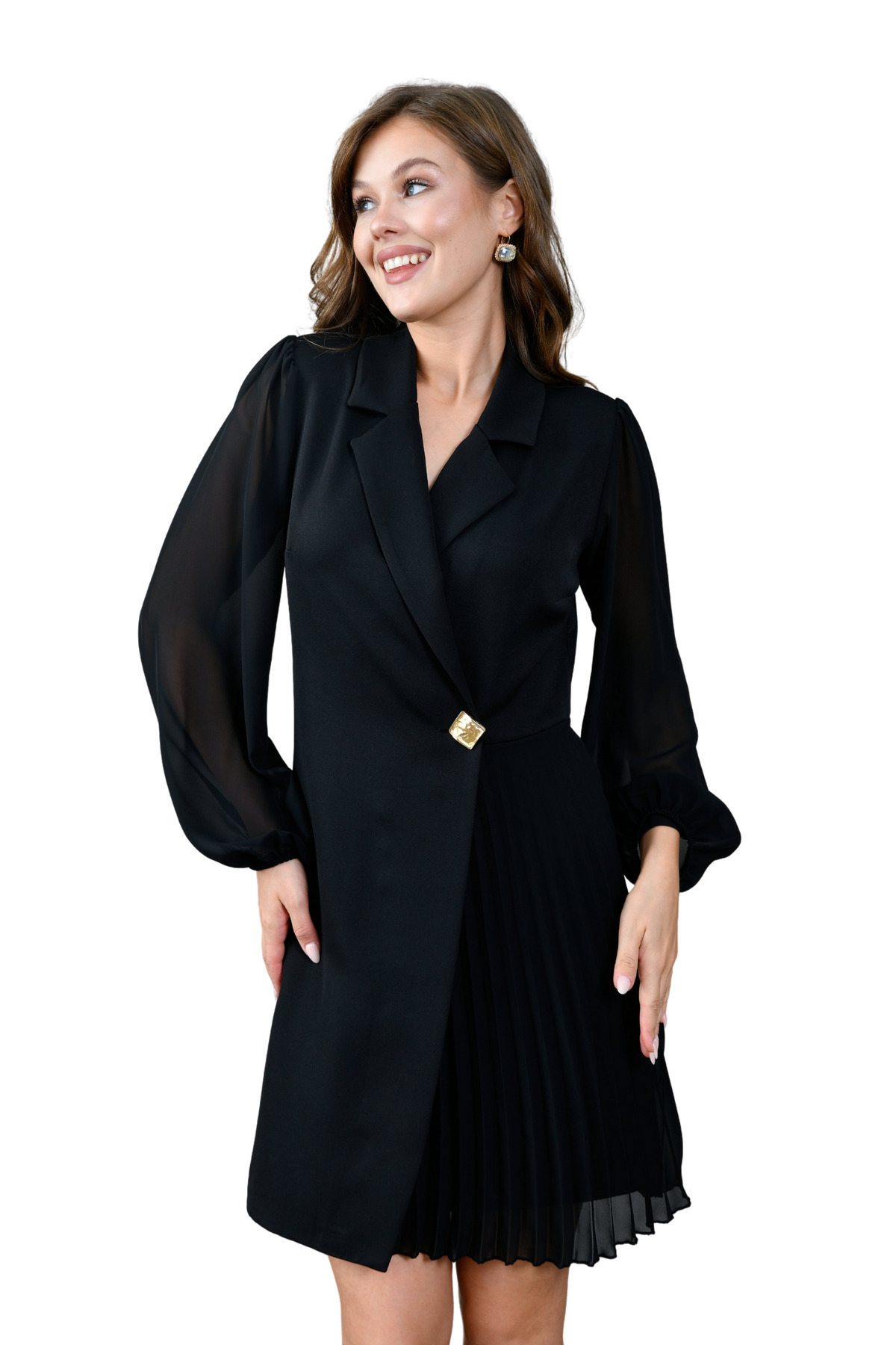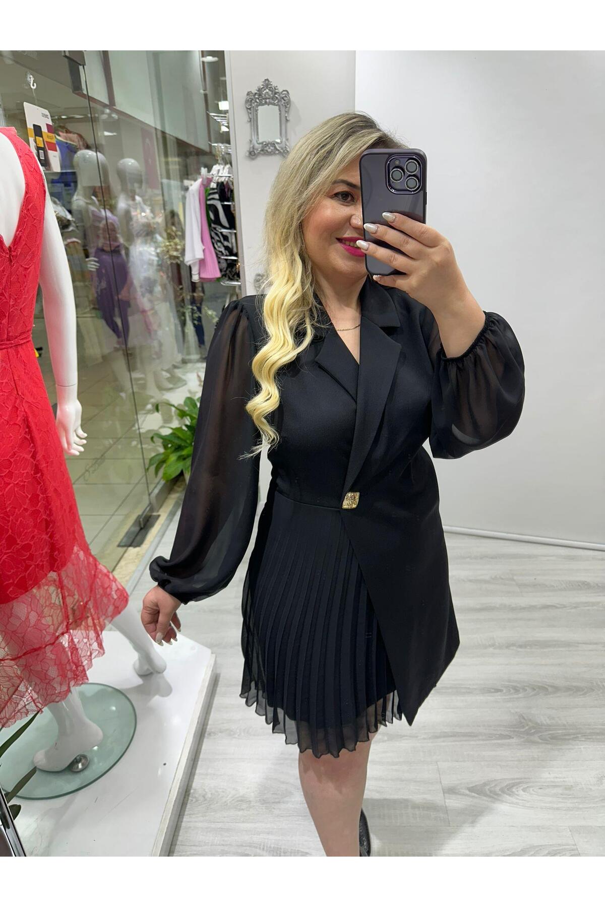 Eteği Piliseli Kruvaze Ceket Yaka Kolları Tül Detaylı Siyah Abiye Elbise Eteği Piliseli Kruvaze Ceket Yaka Kolları Tül Detaylı Siyah Abiye Elbise STP 2169 42