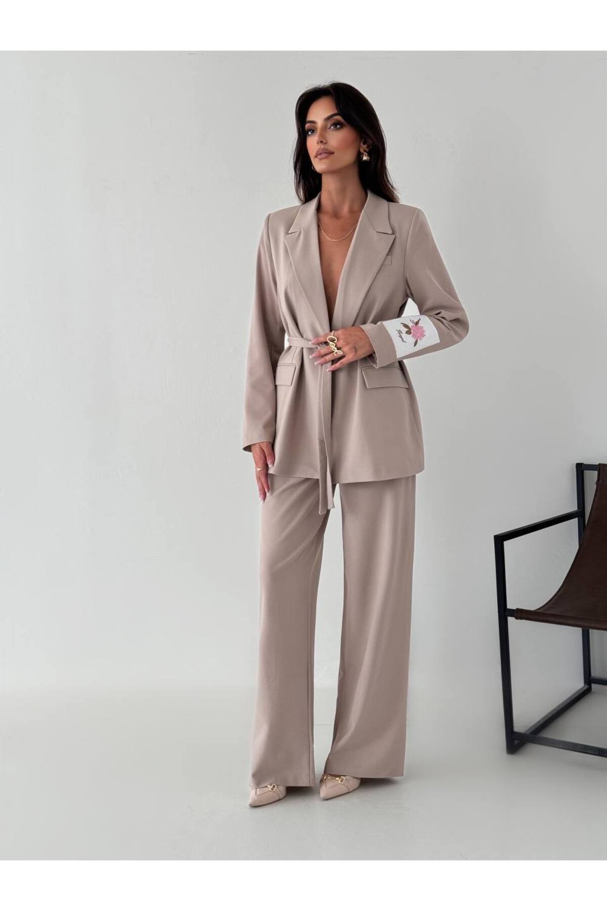 Kadın Kolu Nakış Detay Pantolon Kemerli Ceket Takımı Taş Kadın Kolu Nakış Detay Pantolon Kemerli Ceket Takımı Taş CET3003 L