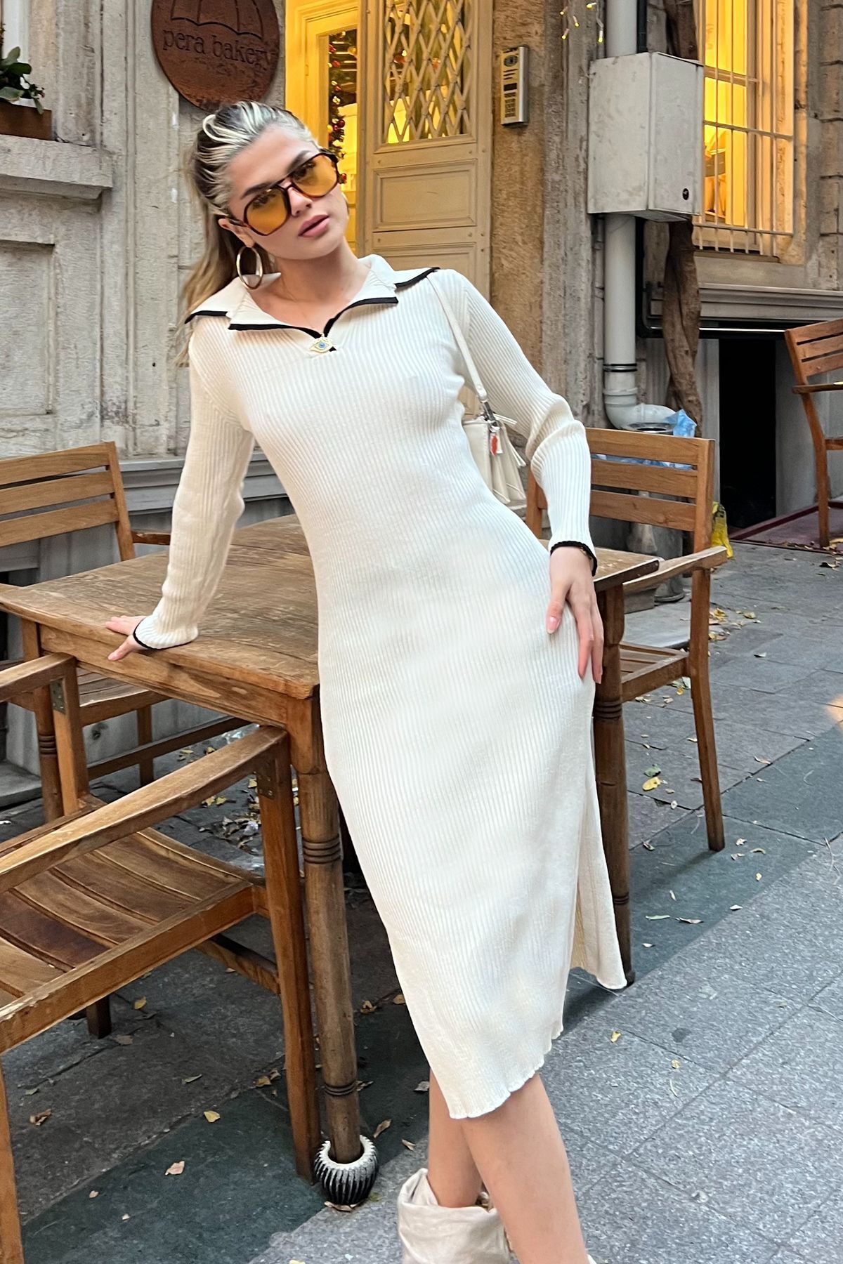 Bej Polo Yaka Triko Midi Elbise Bej Polo Yaka Triko Midi Elbise LAPTELBISE Standart