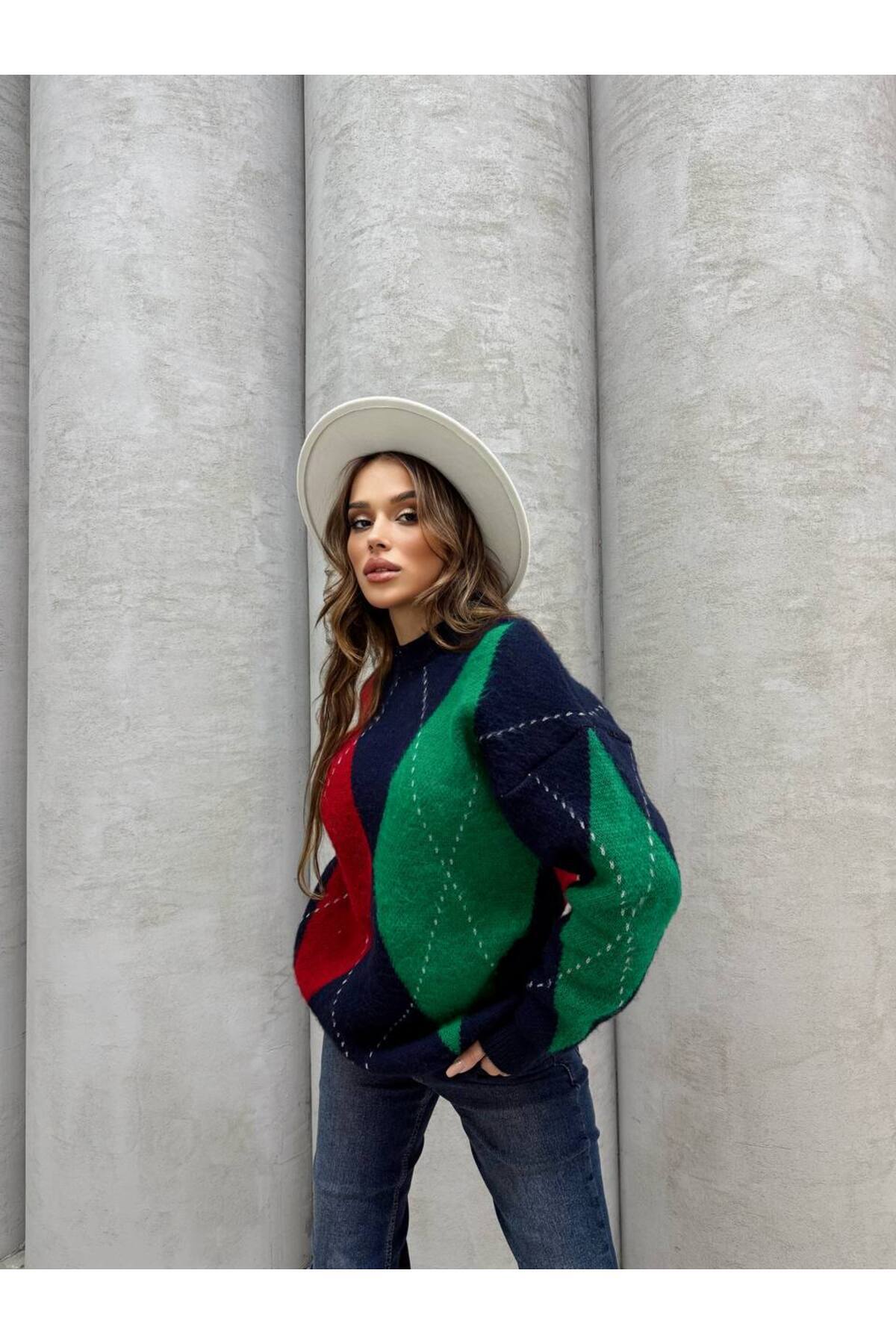 Renk Bloklu Oversize Kadın Kazak Renk Bloklu Oversize Kadın Kazak 23010 Standart
