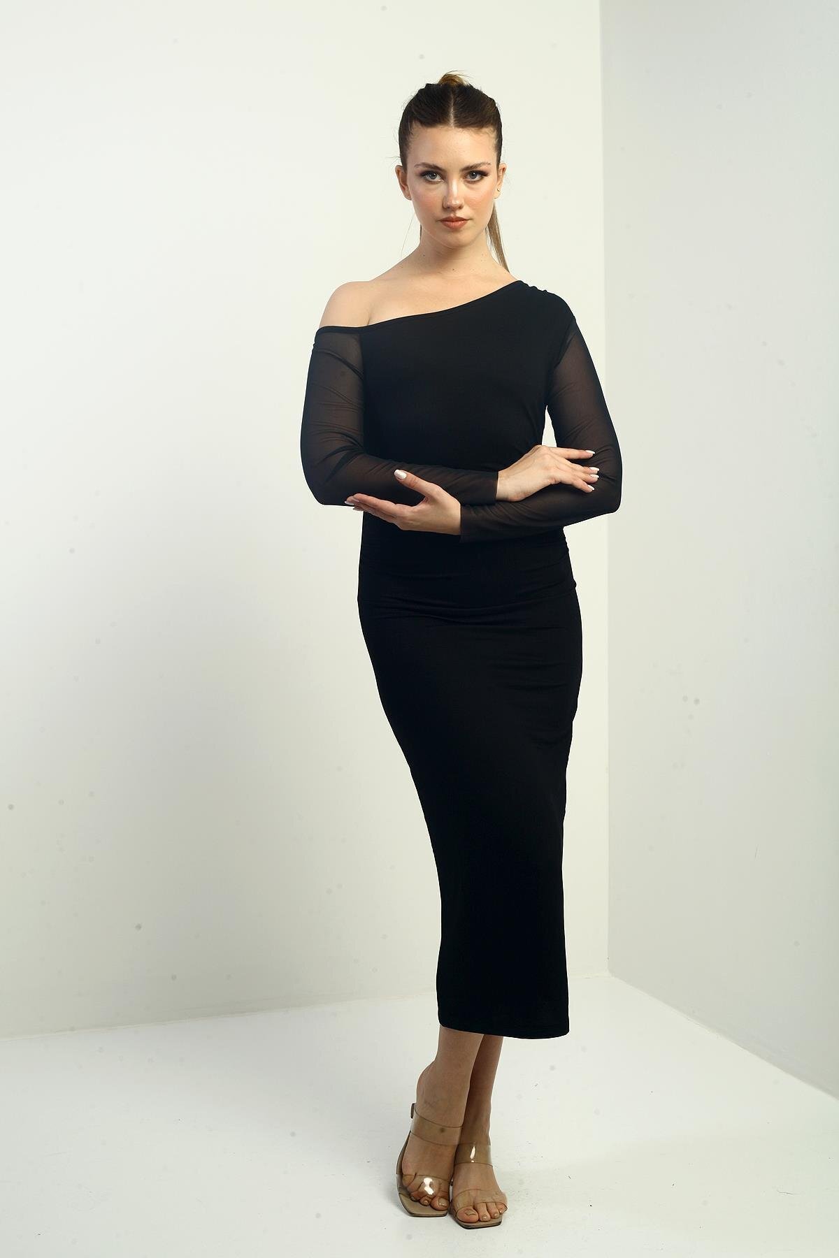 Kadın Kristal Tül Kollu Beli Büzgülü Uzun Elbise Kadın Kristal Tül Kollu Beli Büzgülü Uzun Elbise S-24Y2220021 2XL
