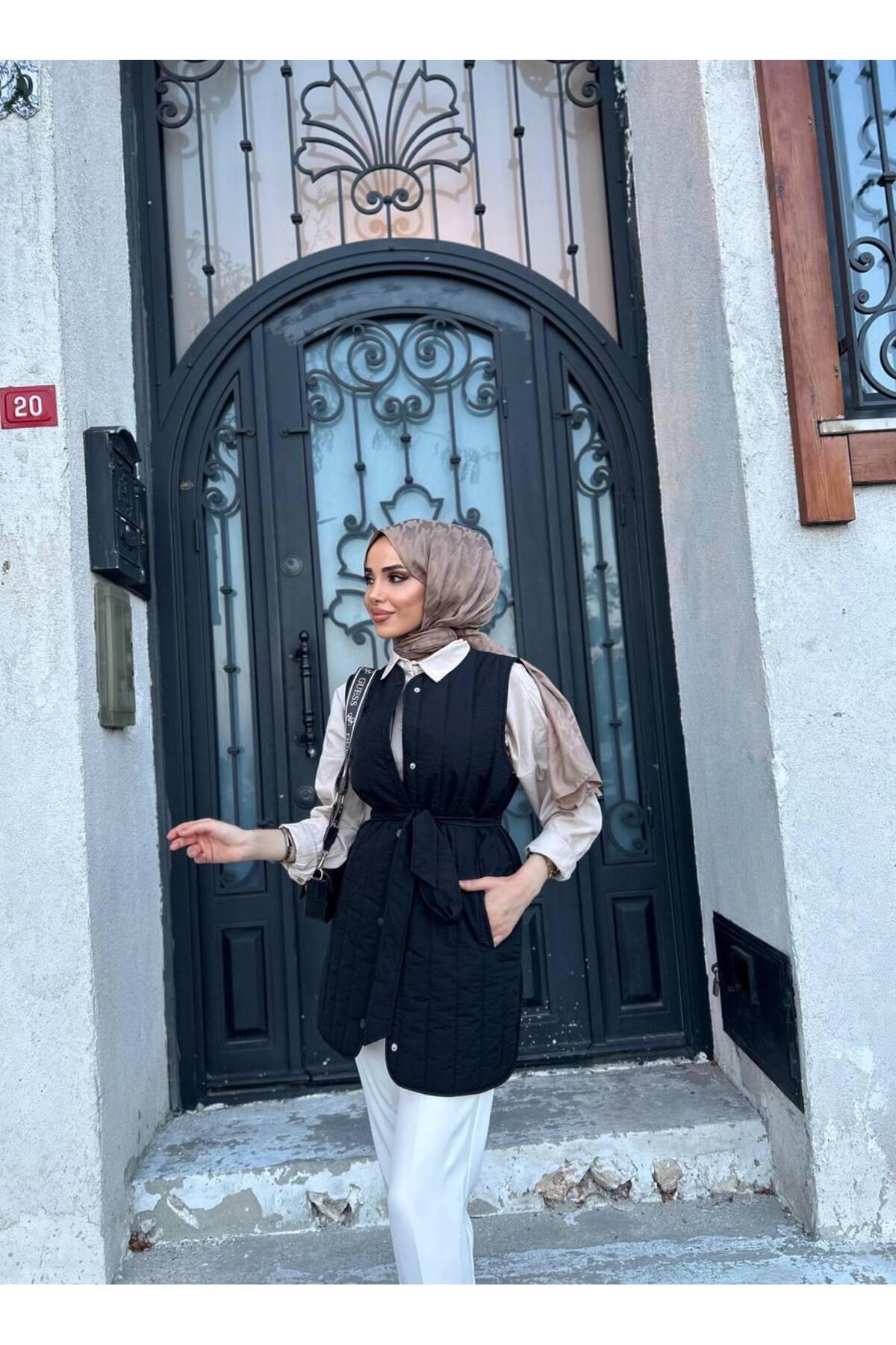 Kadın Midi Boy Kapitone Kuşaklı Yelek Kadın Midi Boy Kapitone Kuşaklı Yelek 244121901 2