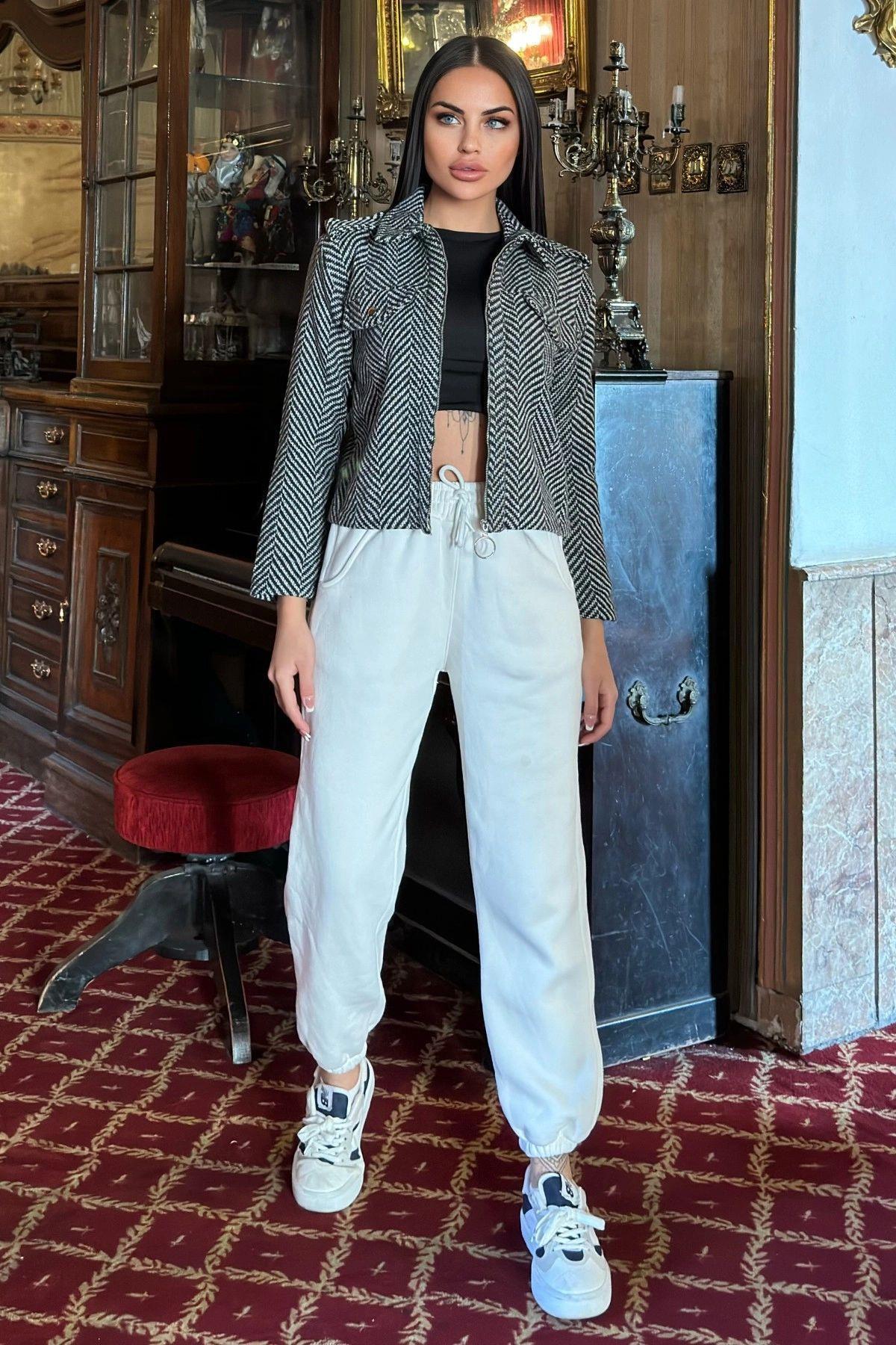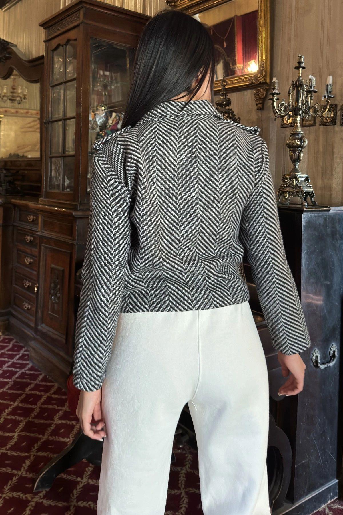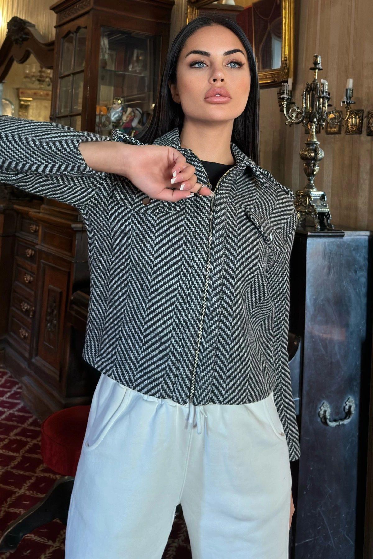 Siyah Balıksırtı Desenli, Fermuarlı, Kısa Kaşe Ceket Siyah Balıksırtı Desenli, Fermuarlı, Kısa Kaşe Ceket NY3682 42