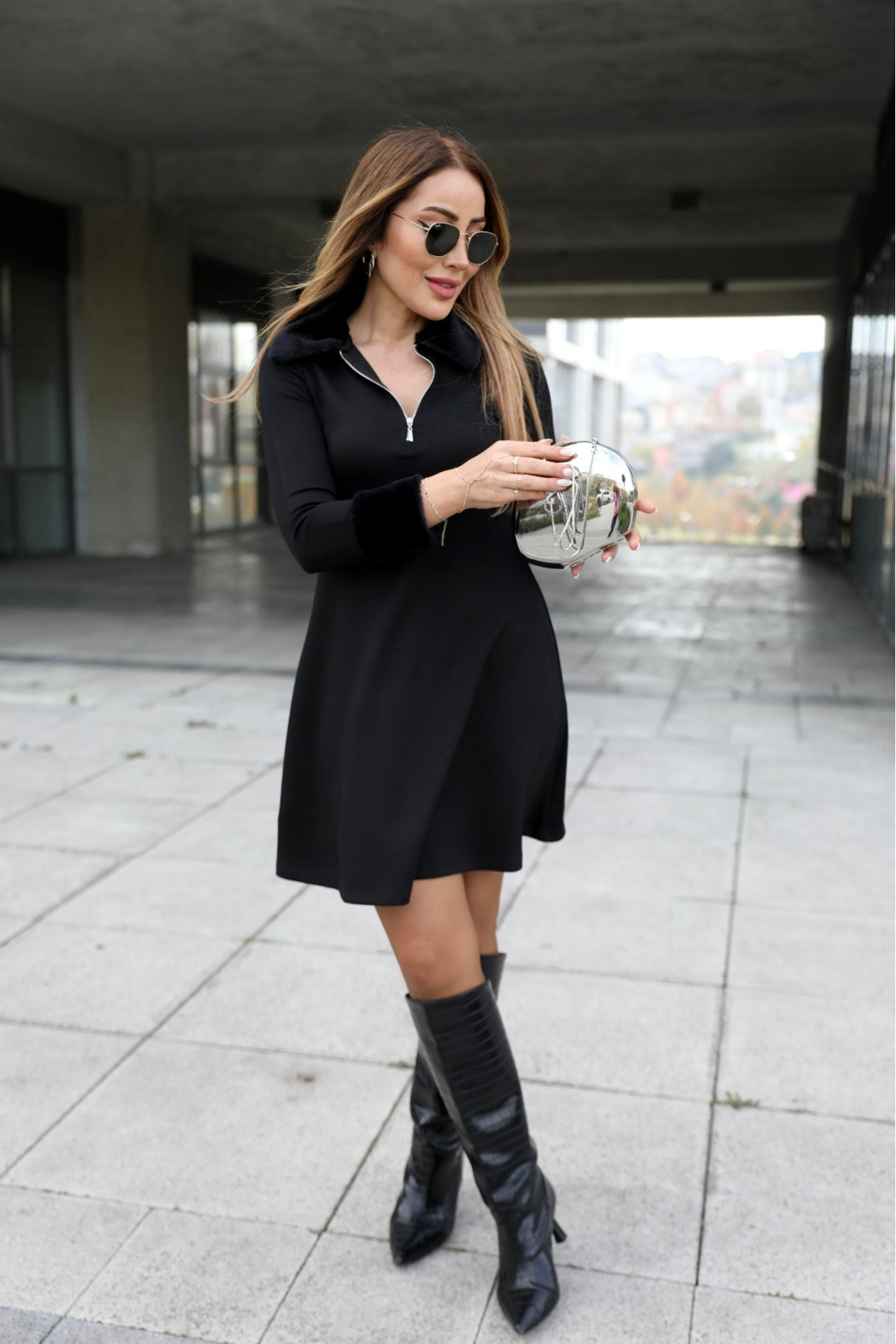 Kadın Yaka Ve Kol Kürk Detay Fermuar Dekolteli Siyah Mini Elbise Kadın Yaka Ve Kol Kürk Detay Fermuar Dekolteli Siyah Mini Elbise SNN128057 2XL-3XL