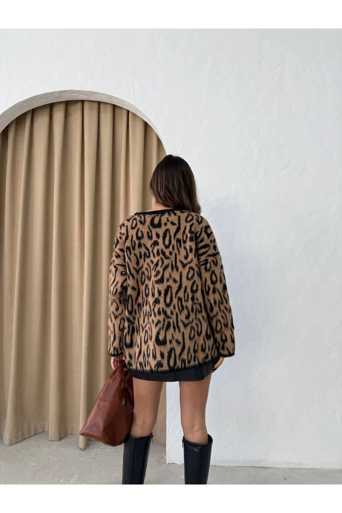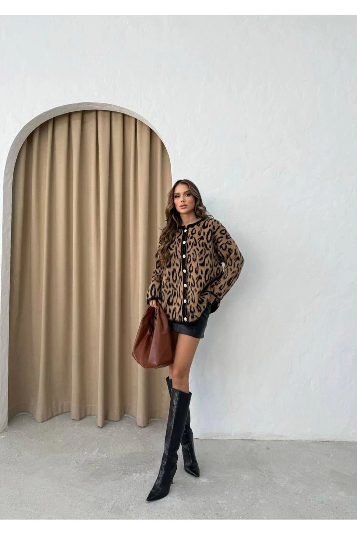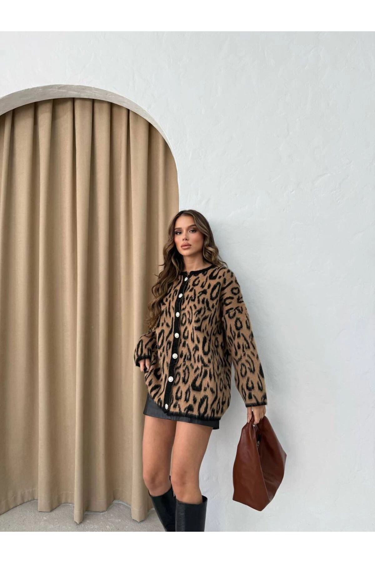 Kadın Krem-kahve Düğmeli Uzun Leopar Desenli Kalın Yumoş Peluş Şardonlu Kışlık Triko Hırka Kadın Krem-kahve Düğmeli Uzun Leopar Desenli Kalın Yumoş Peluş Şardonlu Kışlık Triko Hırka MTC0087 XL