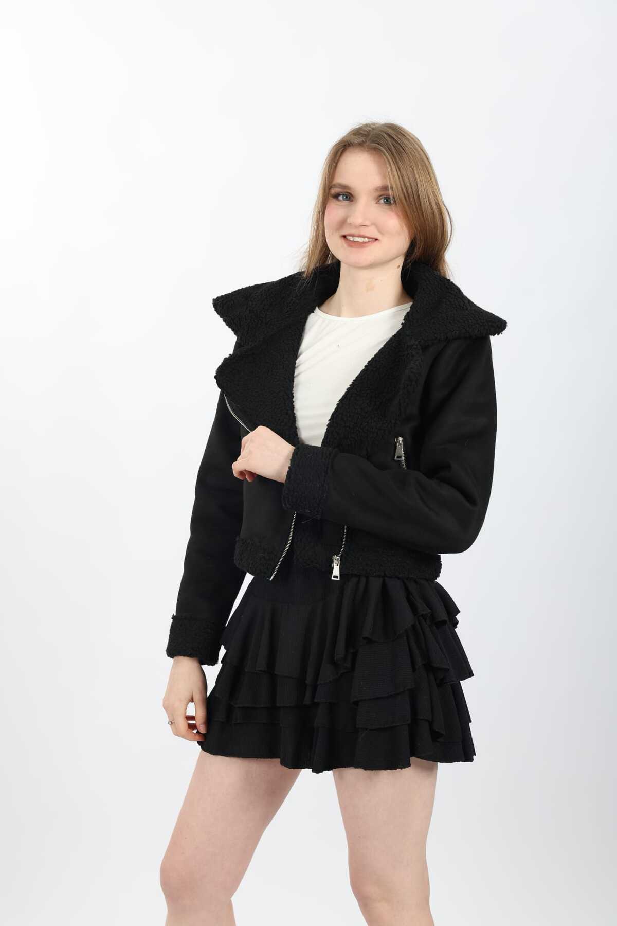 Kürk Yaka Süet Biker Ceket Siyah Kürk Yaka Süet Biker Ceket Siyah TYC15C4BFE94993B01 XL