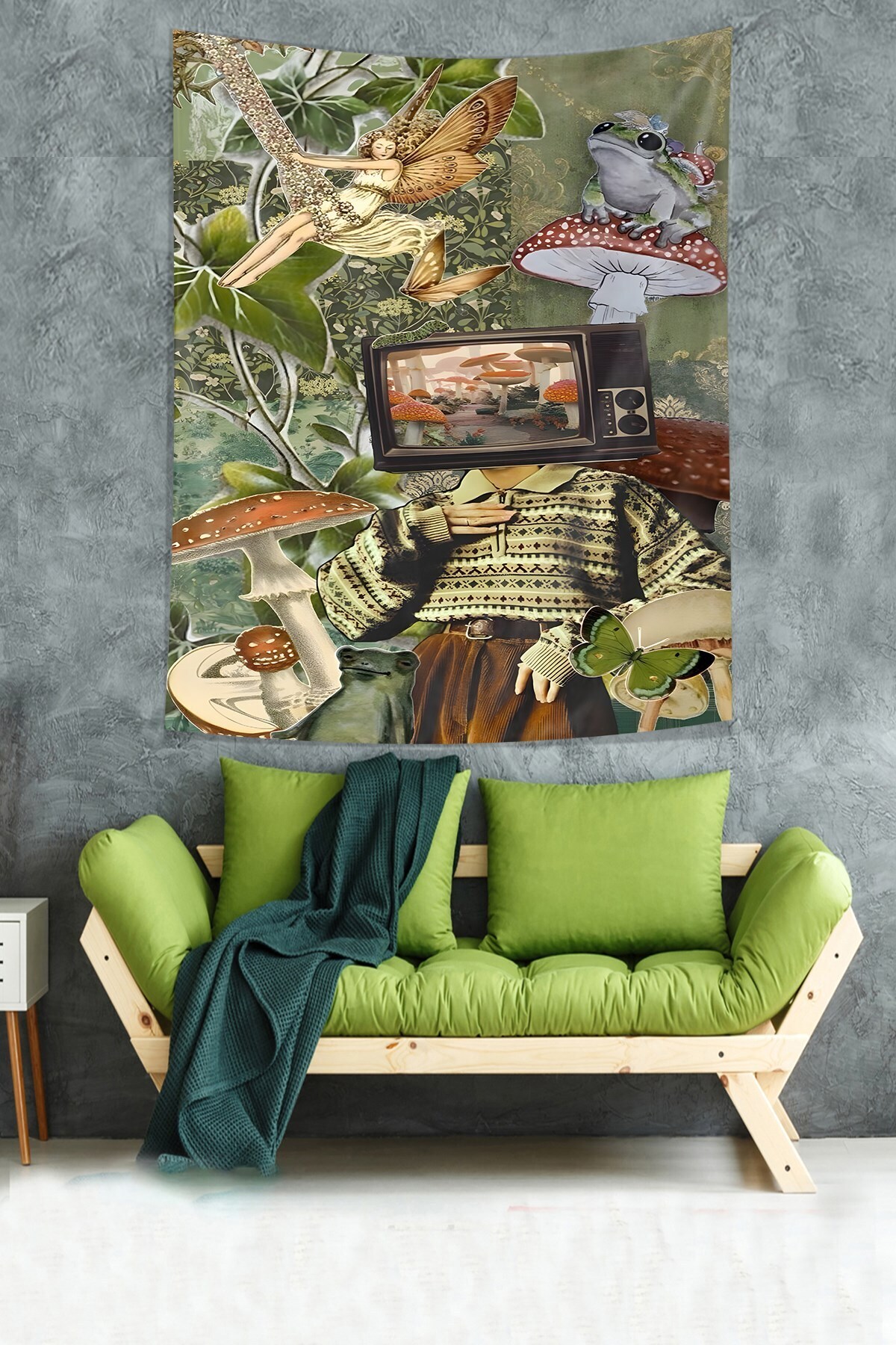 Vintage Tema Orman Mantar ve Kurbağa Desenli Leke Tutmaz Kumaş Duvar Örtüsü Duvar Halısı Tapestry Vintage Tema Orman Mantar ve Kurbağa Desenli Leke Tutmaz Kumaş Duvar Örtüsü Duvar Halısı Tapestry PNTRS33 140 x 230