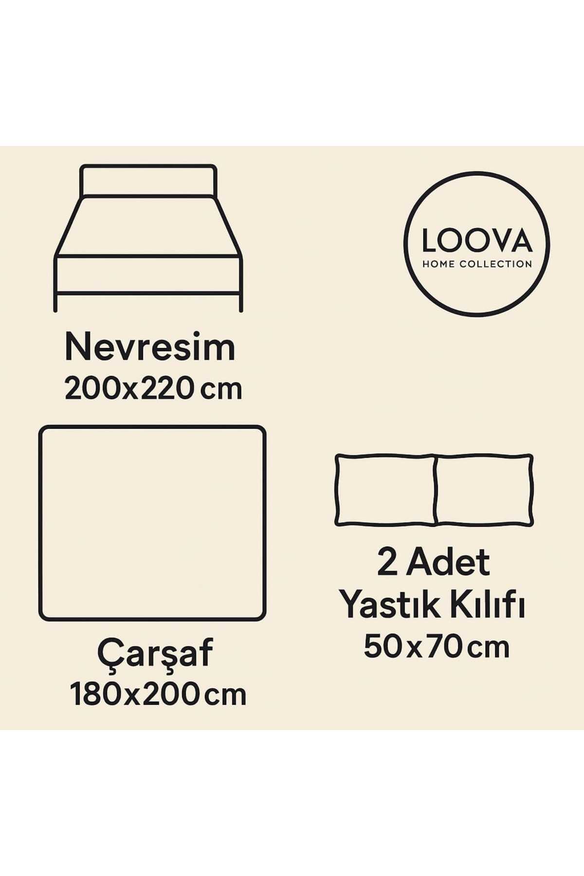 - Materyal Bileşeni : Yorgan Kılıfı 200 cm x 240 cm; Çarşaf 220 cm x 240 cm; 2 Adet Yastık Kılıfı 50 cm x 70 cm;