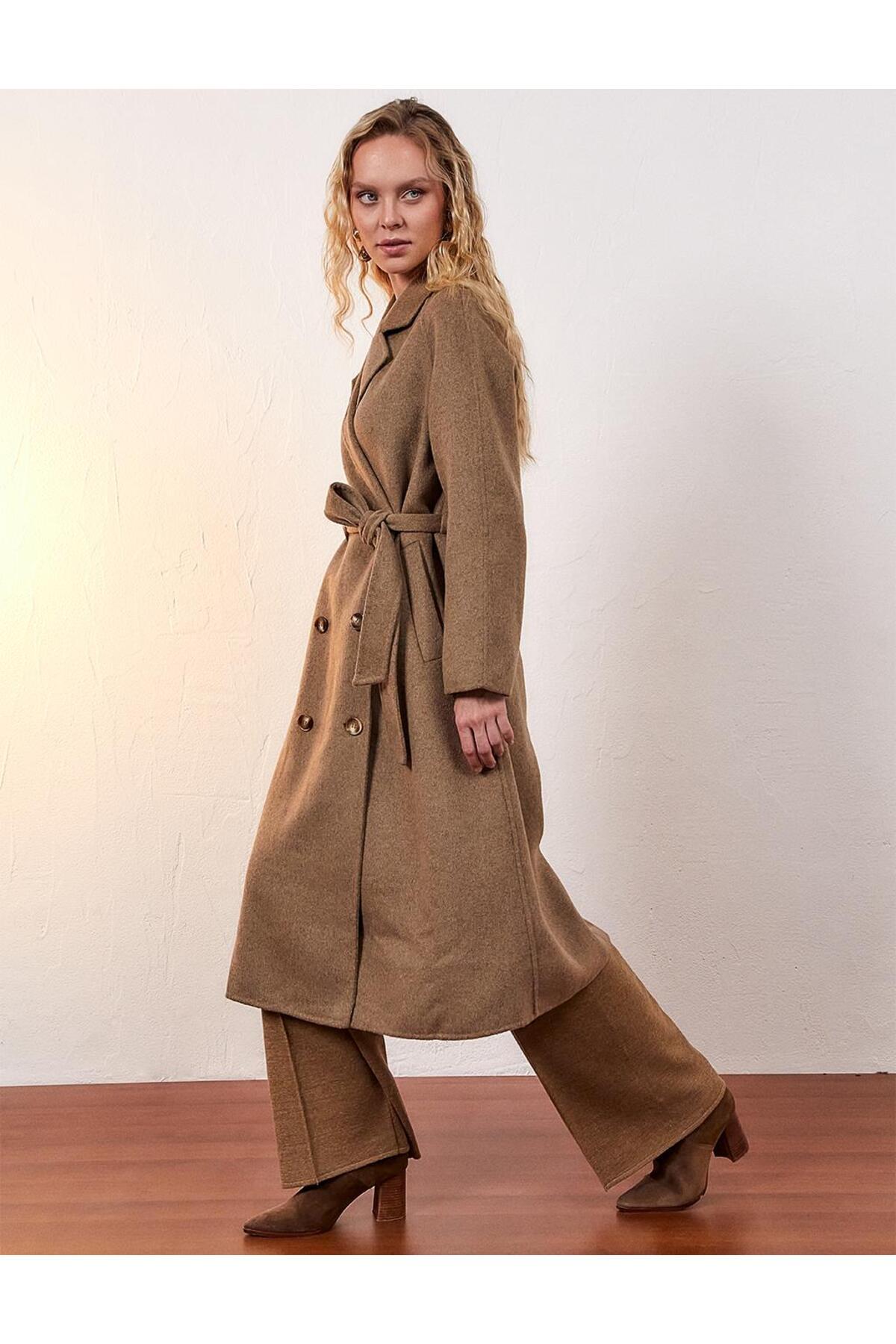 Premium Dik Yaka Kruvaze Kuşaklı Kaşe Kaban Camel Premium Dik Yaka Kruvaze Kuşaklı Kaşe Kaban Camel KA-A23-17038 44