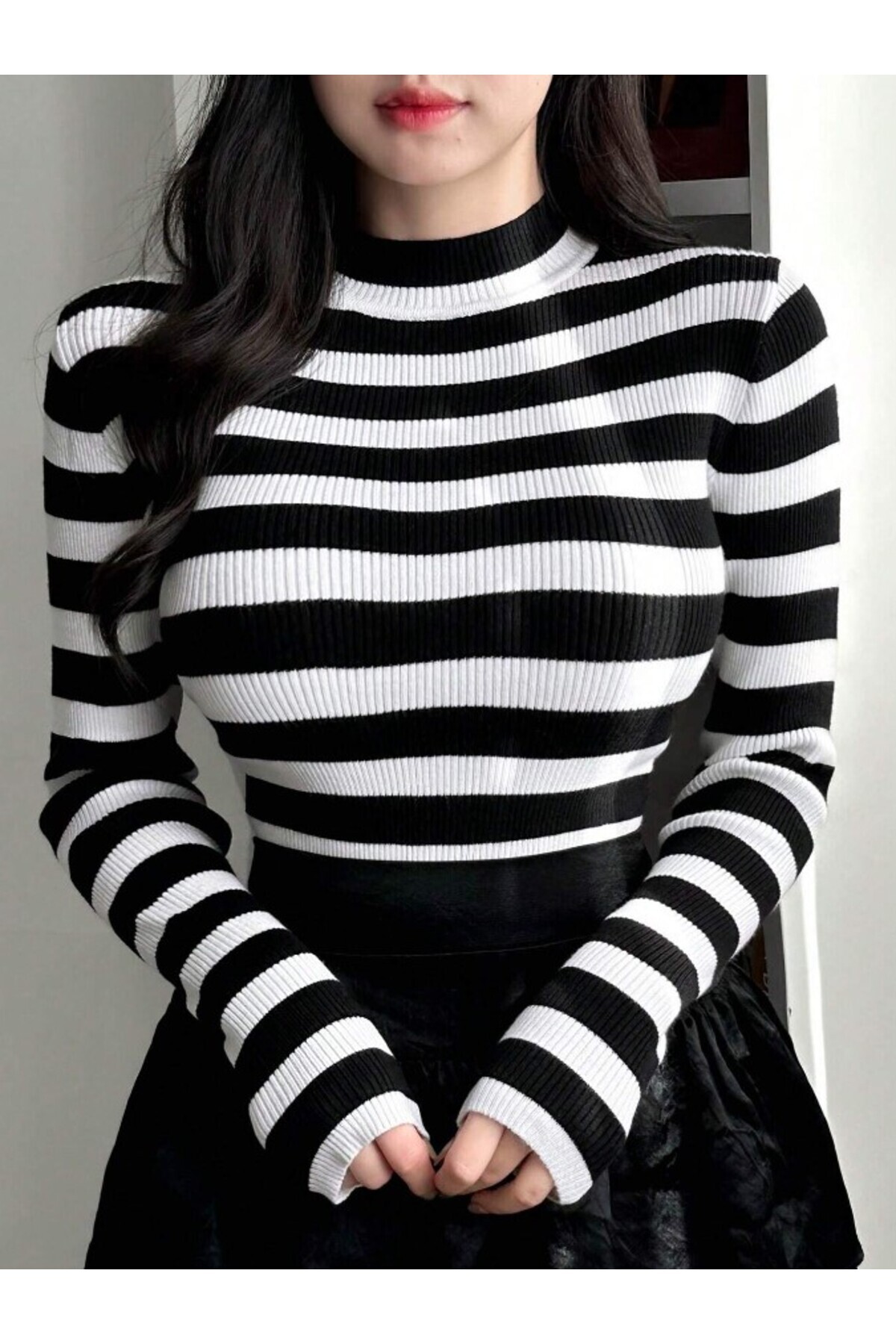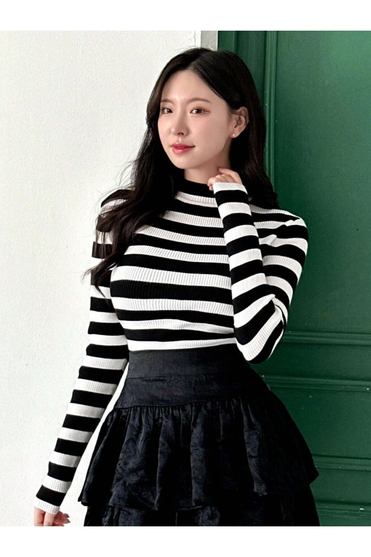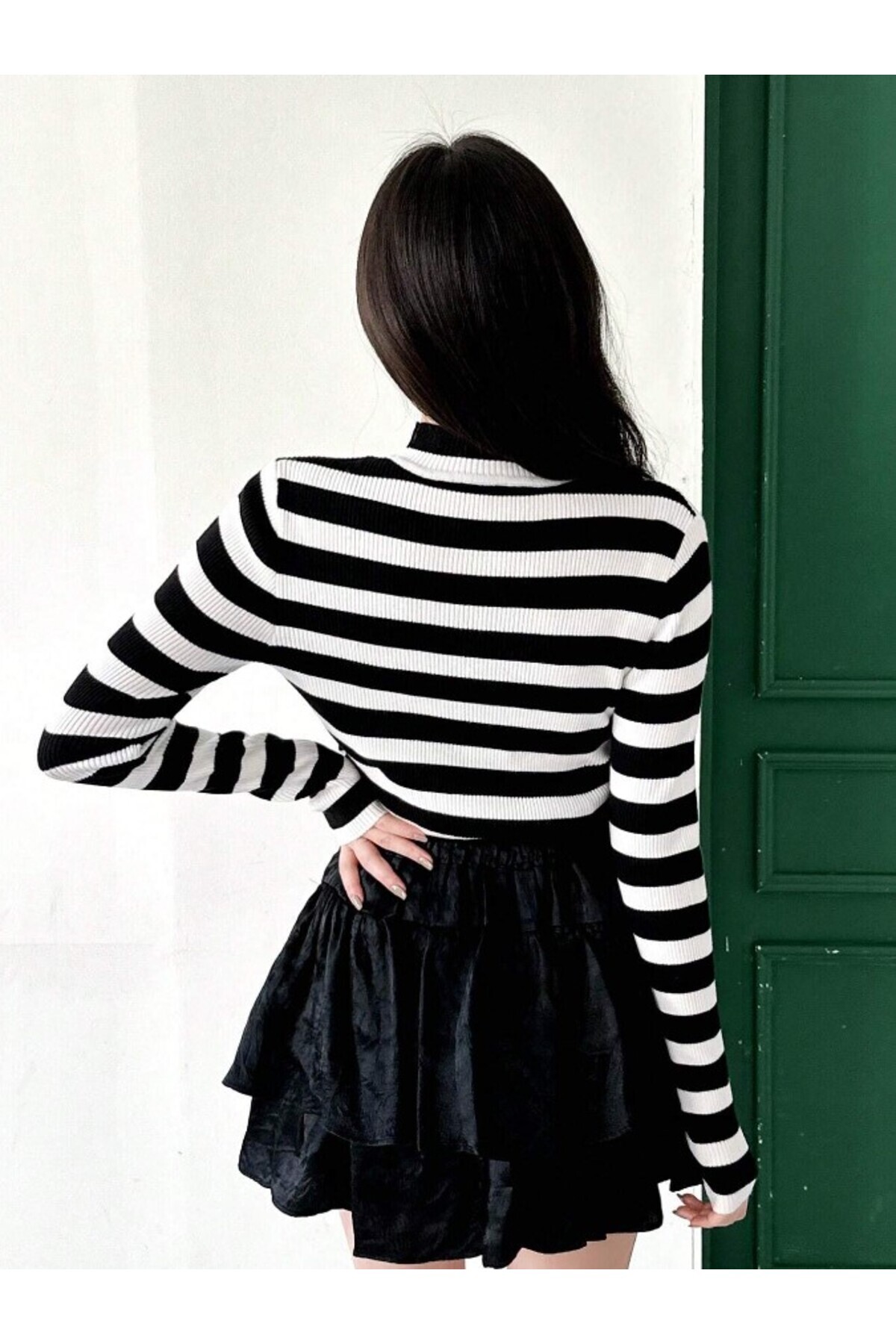 Kadın Siyah Beyaz Çizgili Yarım Balıkçı Yaka Bluz Kazak Kadın Siyah Beyaz Çizgili Yarım Balıkçı Yaka Bluz Kazak DR-19000601 L