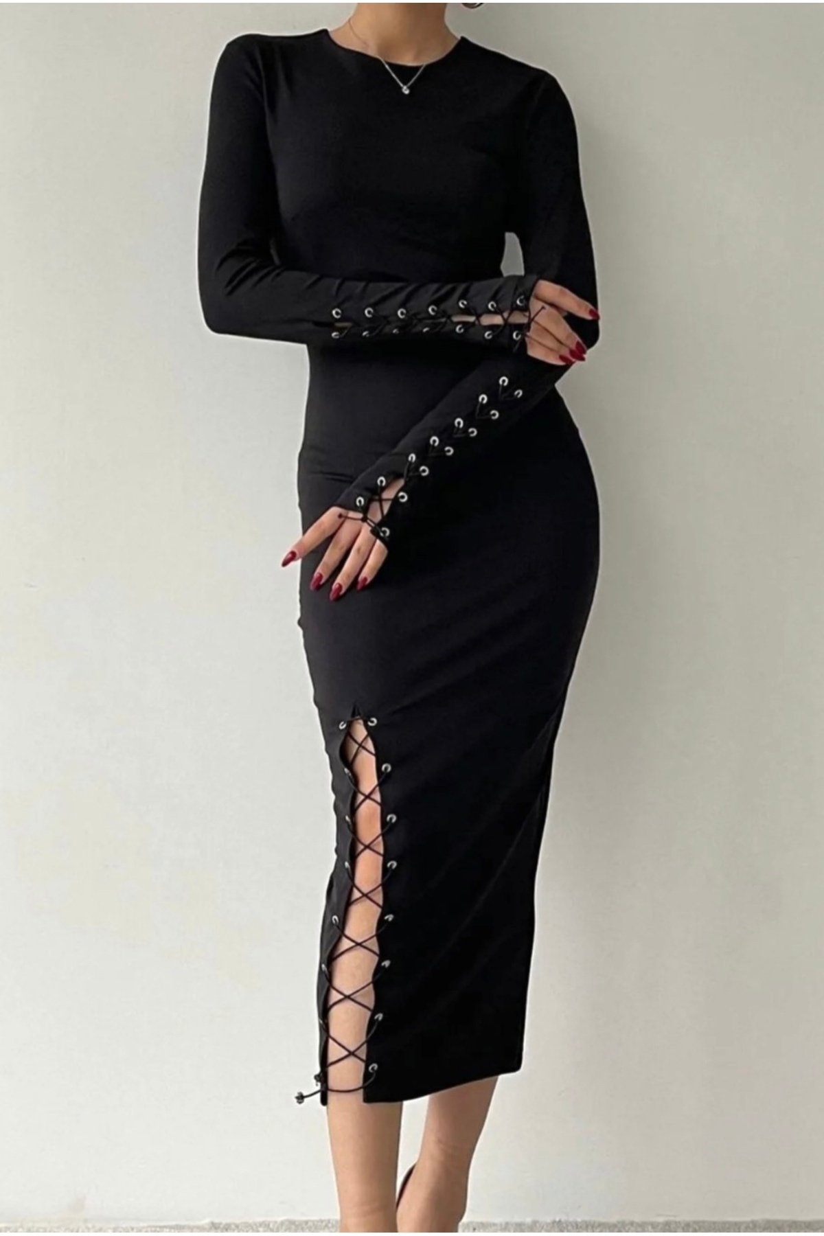 Siyah Kuşgözü Bağcıklı Midi Boy Elbise Siyah Kuşgözü Bağcıklı Midi Boy Elbise BAM-KUSGZ L