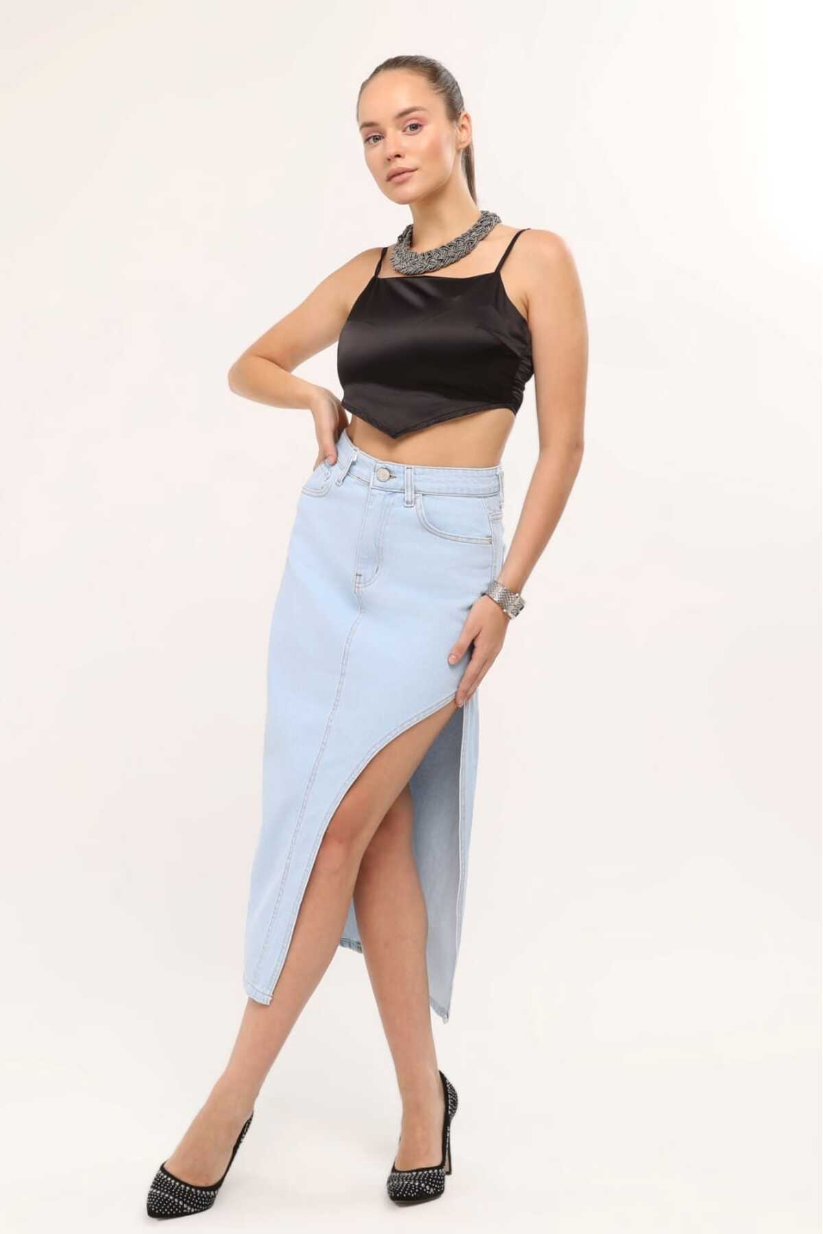 KADIN BUZ MAVİ UZUN ÖN PARÇALI ASİMETRİK KOT ETEK KADIN BUZ MAVİ UZUN ÖN PARÇALI ASİMETRİK KOT ETEK kn012 42