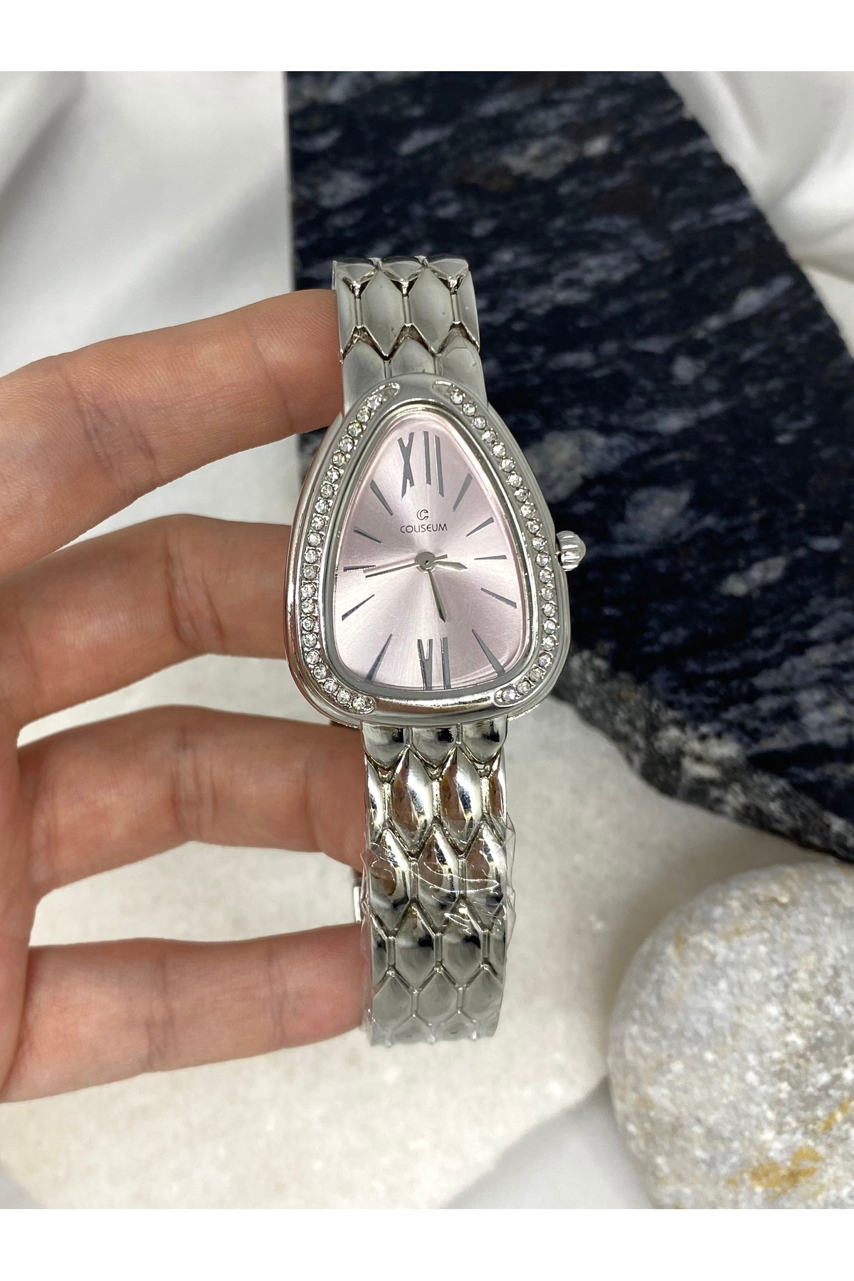 Üçgen Taş Detaylı Vintage İçi Pembe Gümüş Kadın Kol Saati Üçgen Taş Detaylı Vintage İçi Pembe Gümüş Kadın Kol Saati MB0038 تک سایز