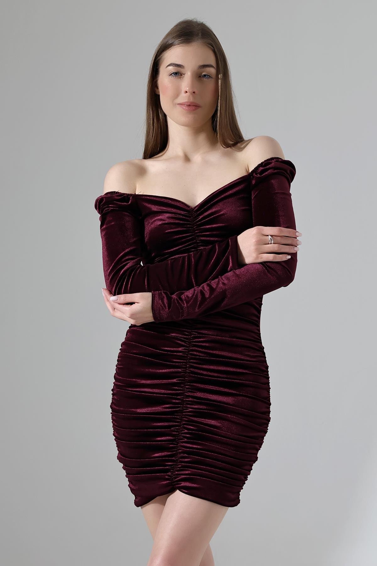 Mürdüm Kadife Kumaş Uzun Kollu Büzgülü Elbise Mürdüm Kadife Kumaş Uzun Kollu Büzgülü Elbise DFX582257 L