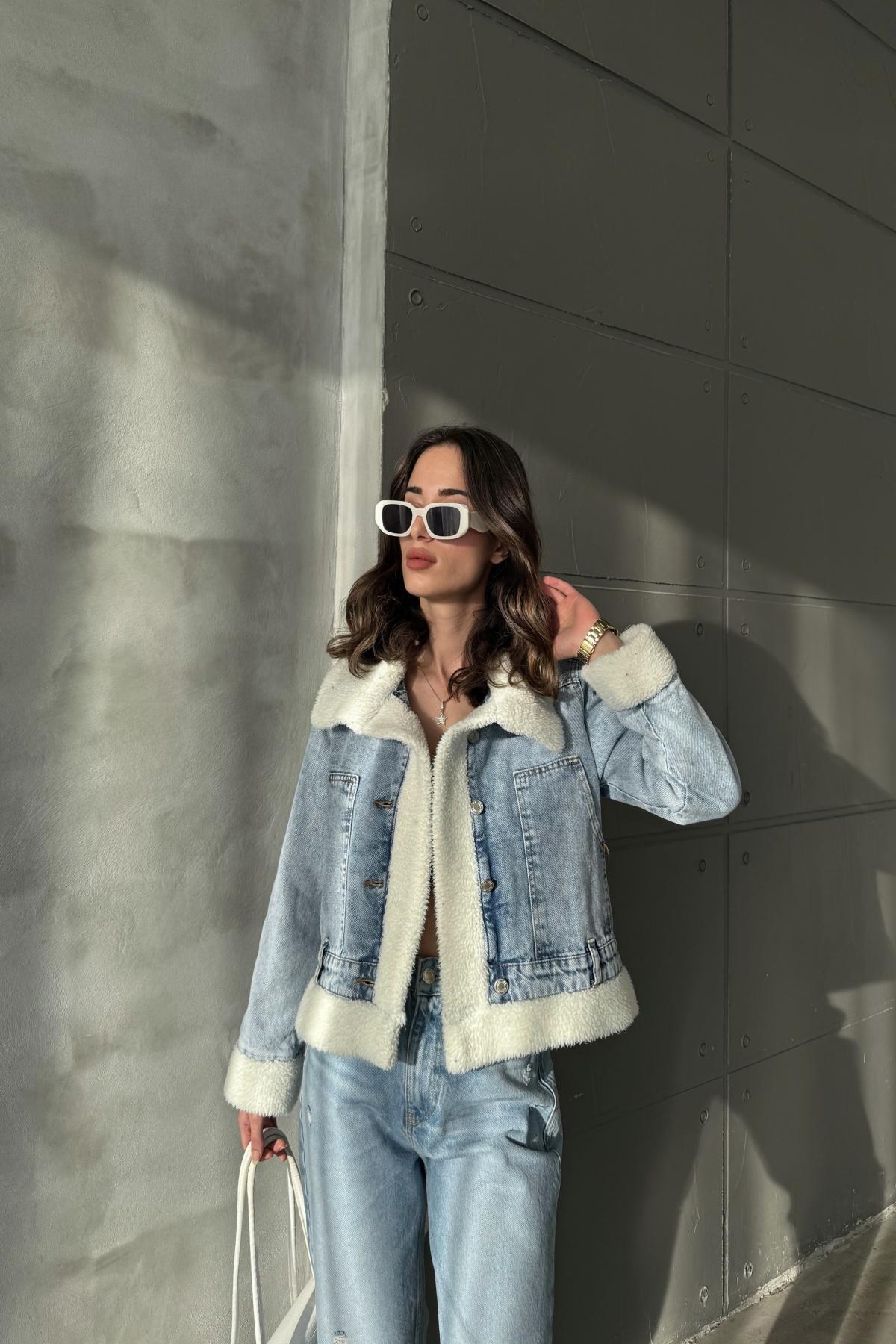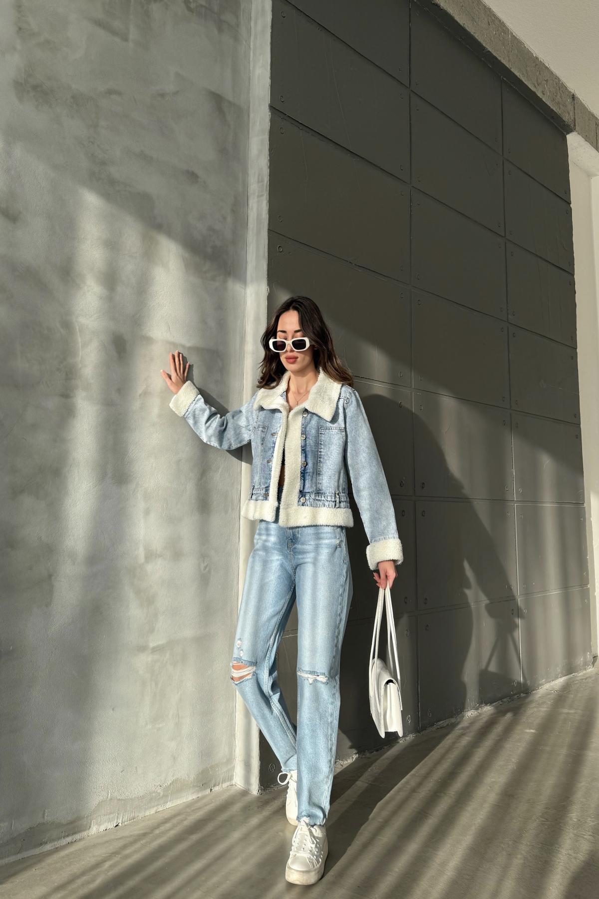 Kadın Oversize Kışlık Peluş Desenli Cepli Mavi Kot Ceket Kadın Oversize Kışlık Peluş Desenli Cepli Mavi Kot Ceket 1282DMJG 2XL