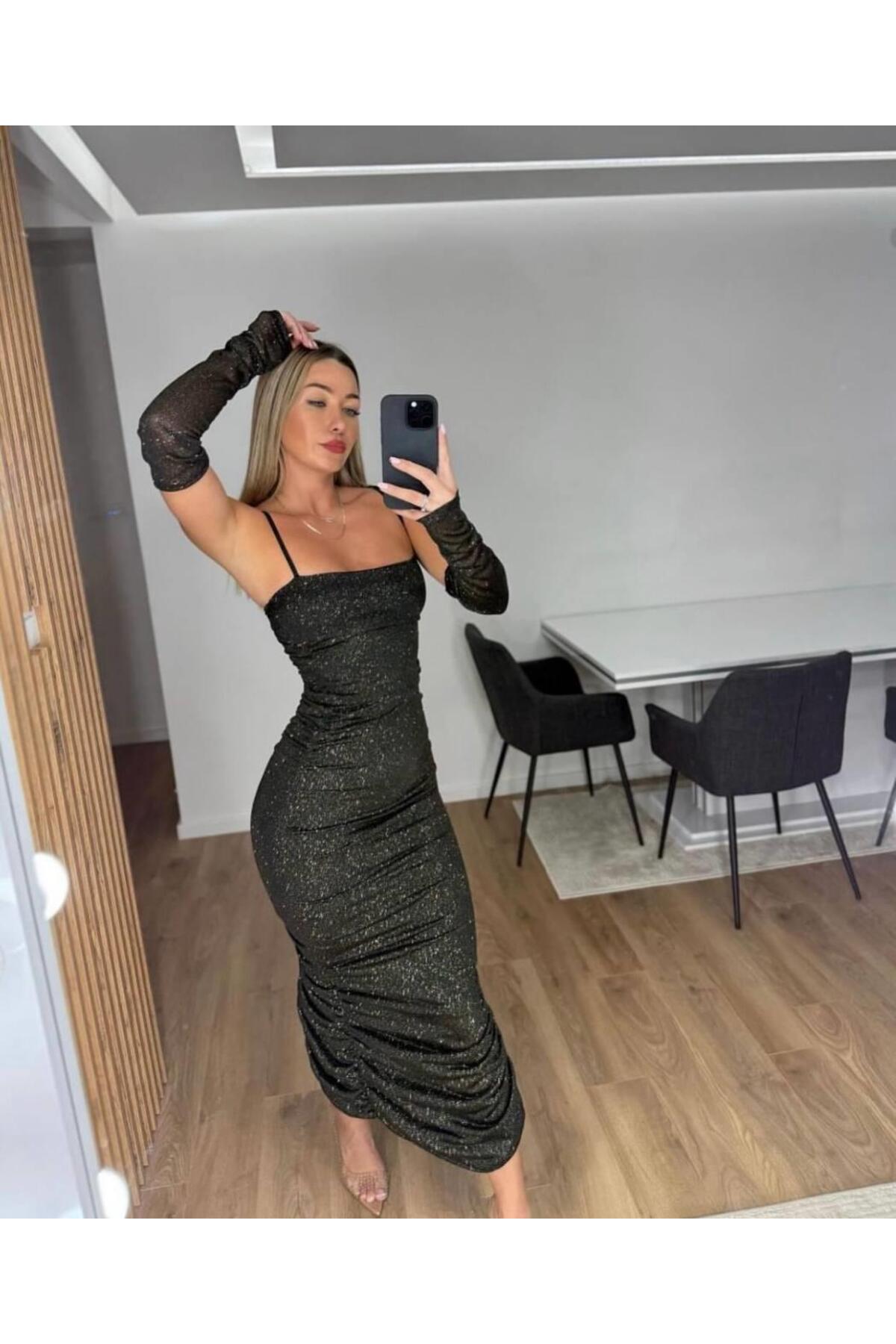 Siyah Simli Eldivenli Şık Gece Elbisesi Siyah Simli Eldivenli Şık Gece Elbisesi ELB112 L