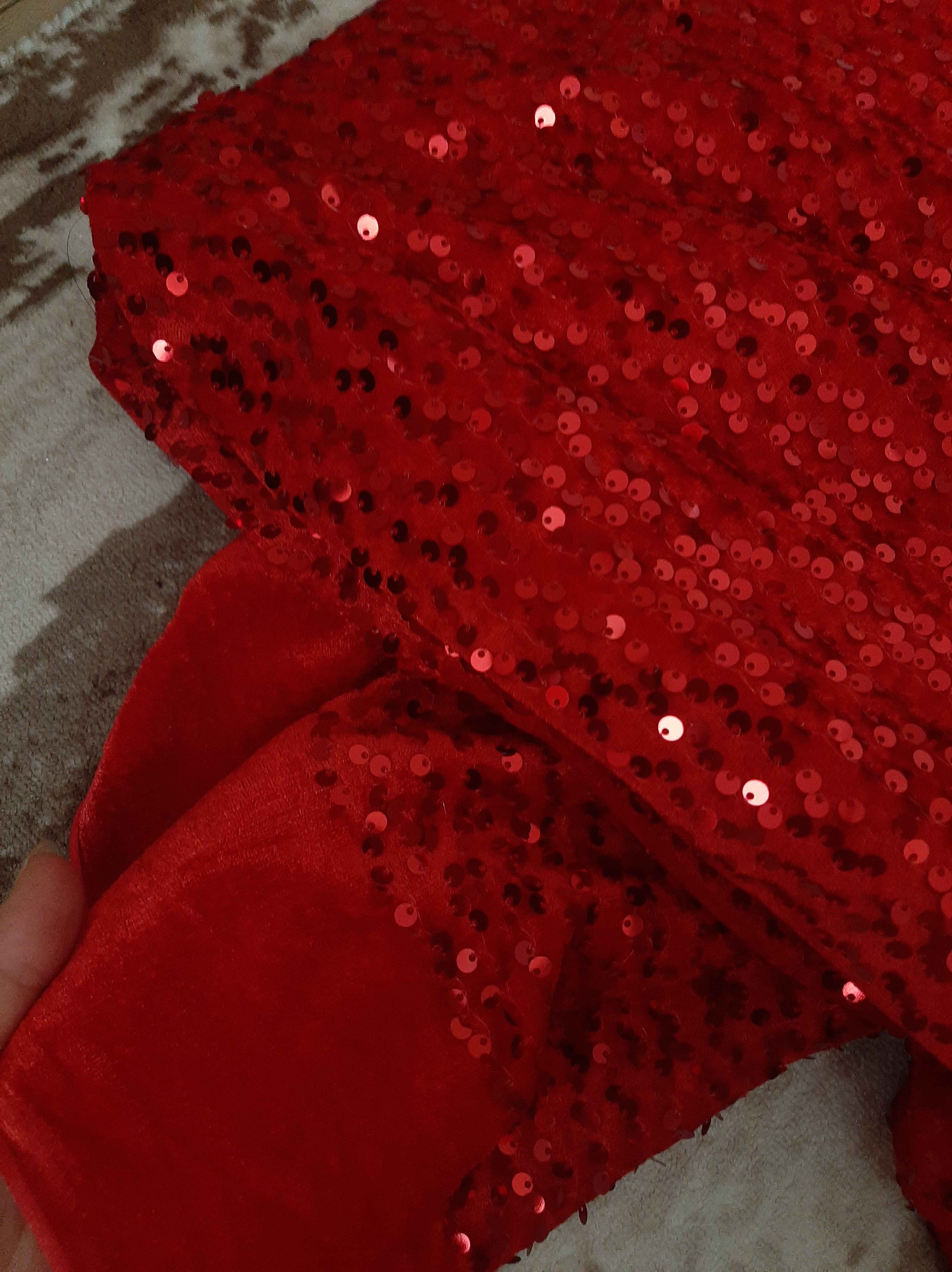 KIRMIZI PULLU KADİFE KUMAŞ KIRMIZI PULLU KADİFE KUMAŞ pullu kadife تک سایز