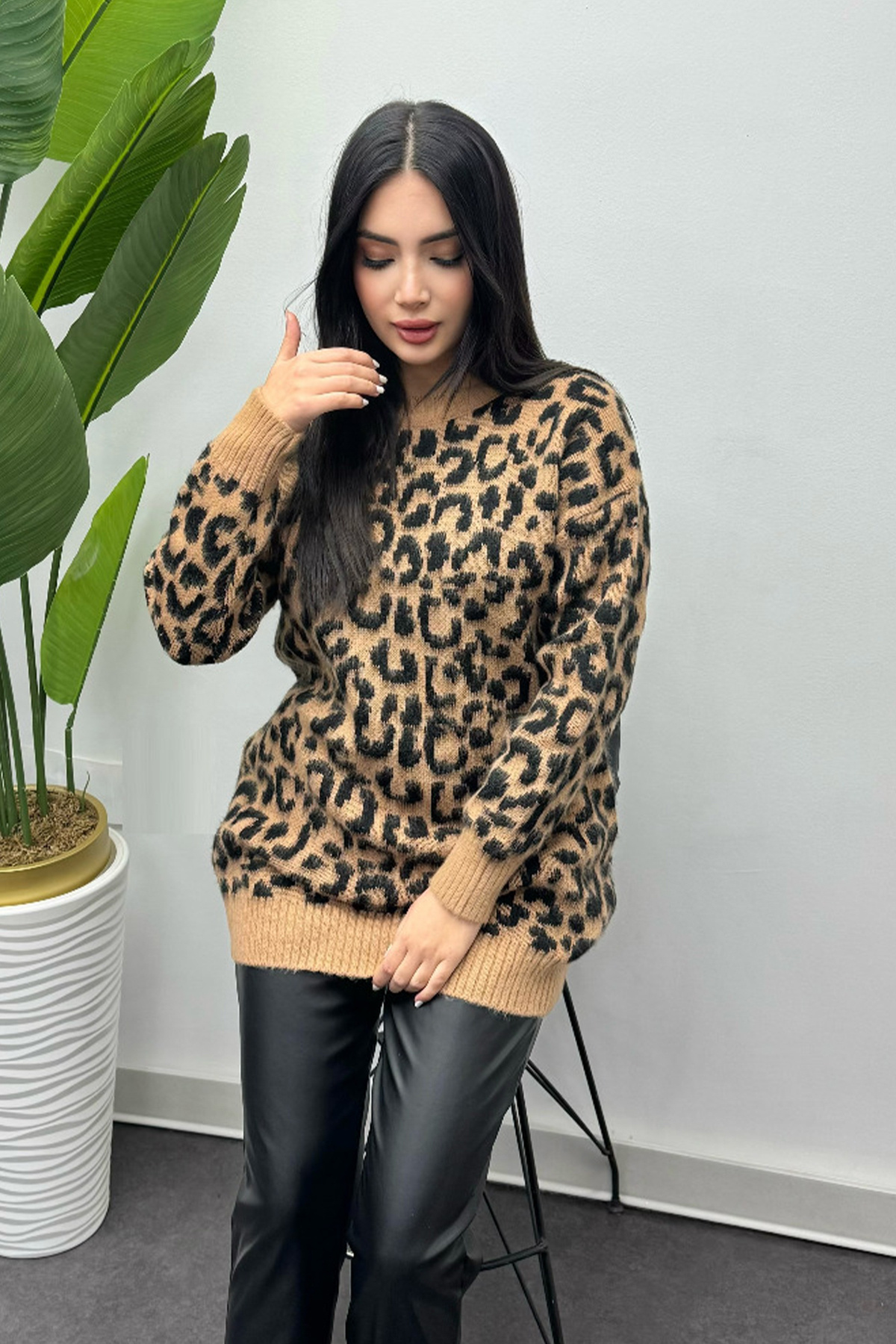 Kadın Leopar Desenli Kazak -Kahverengi Kadın Leopar Desenli Kazak -Kahverengi UGR003 Standart