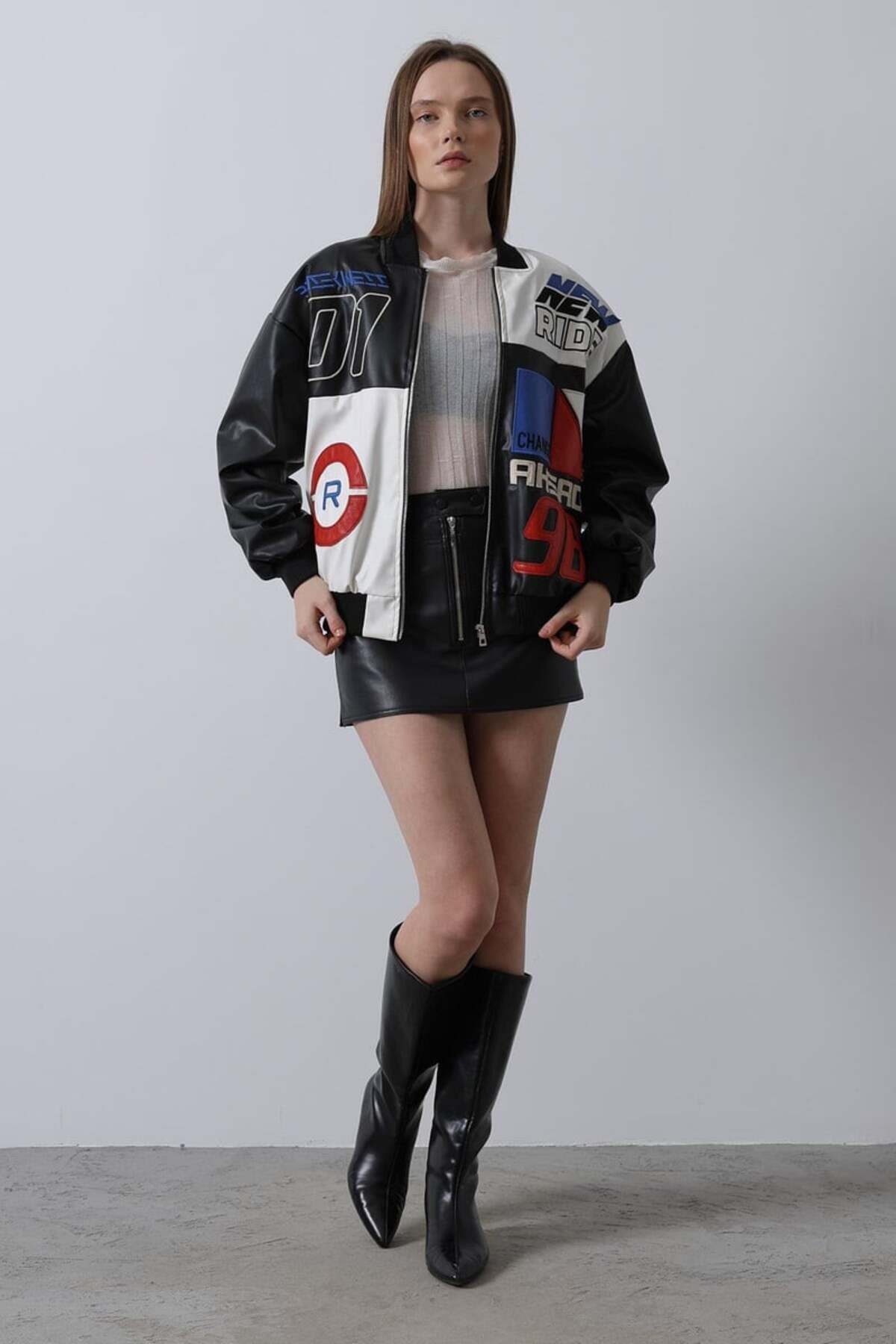 Kadın Oversize Baskılı Deri Şeritli Motorcu Montu Kısa Fermuarlı Yarışçı Ceketi Bomber Kolej Mont Kadın Oversize Baskılı Deri Şeritli Motorcu Montu Kısa Fermuarlı Yarışçı Ceketi Bomber Kolej Mont FTNES L