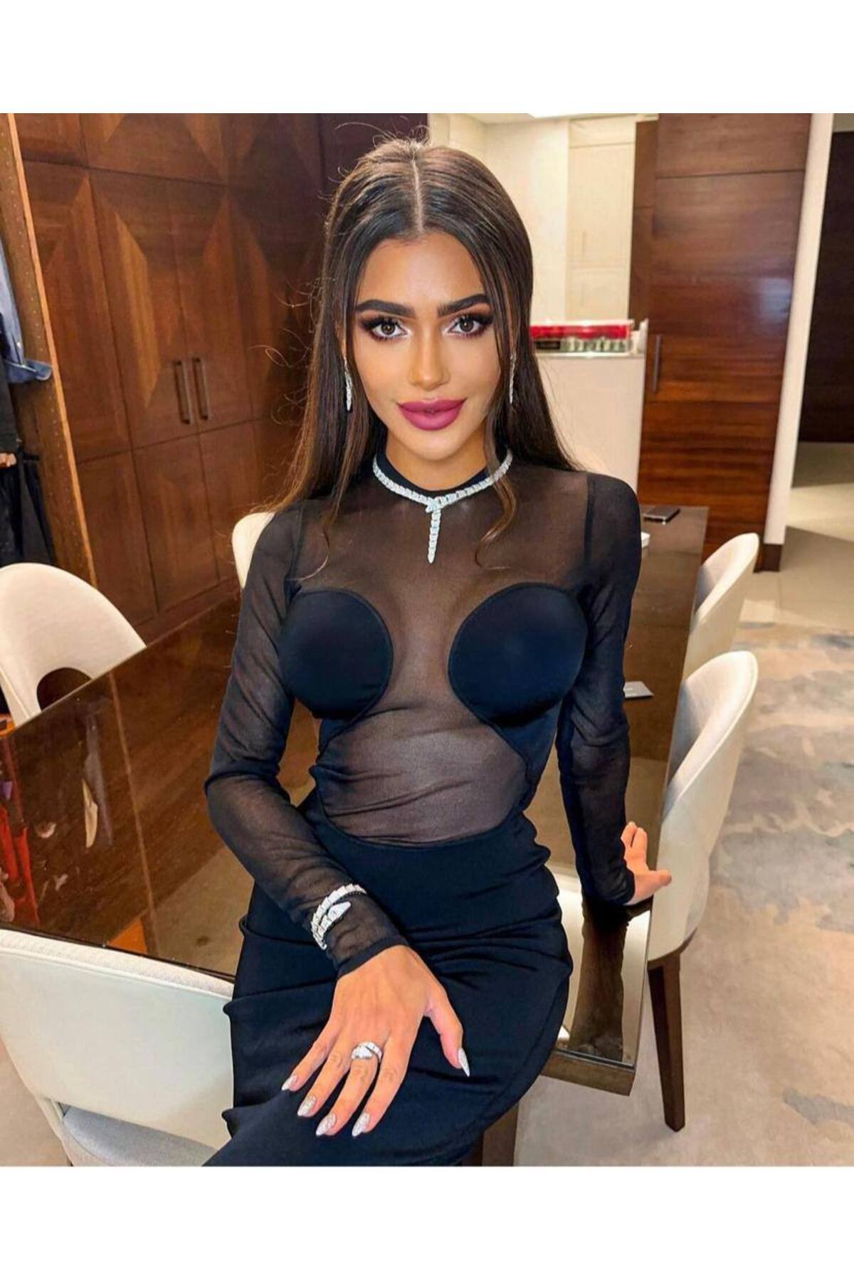 Sandy likralı tül kumaş transparan midi boy elbise Sandy likralı tül kumaş transparan midi boy elbise B5001 L