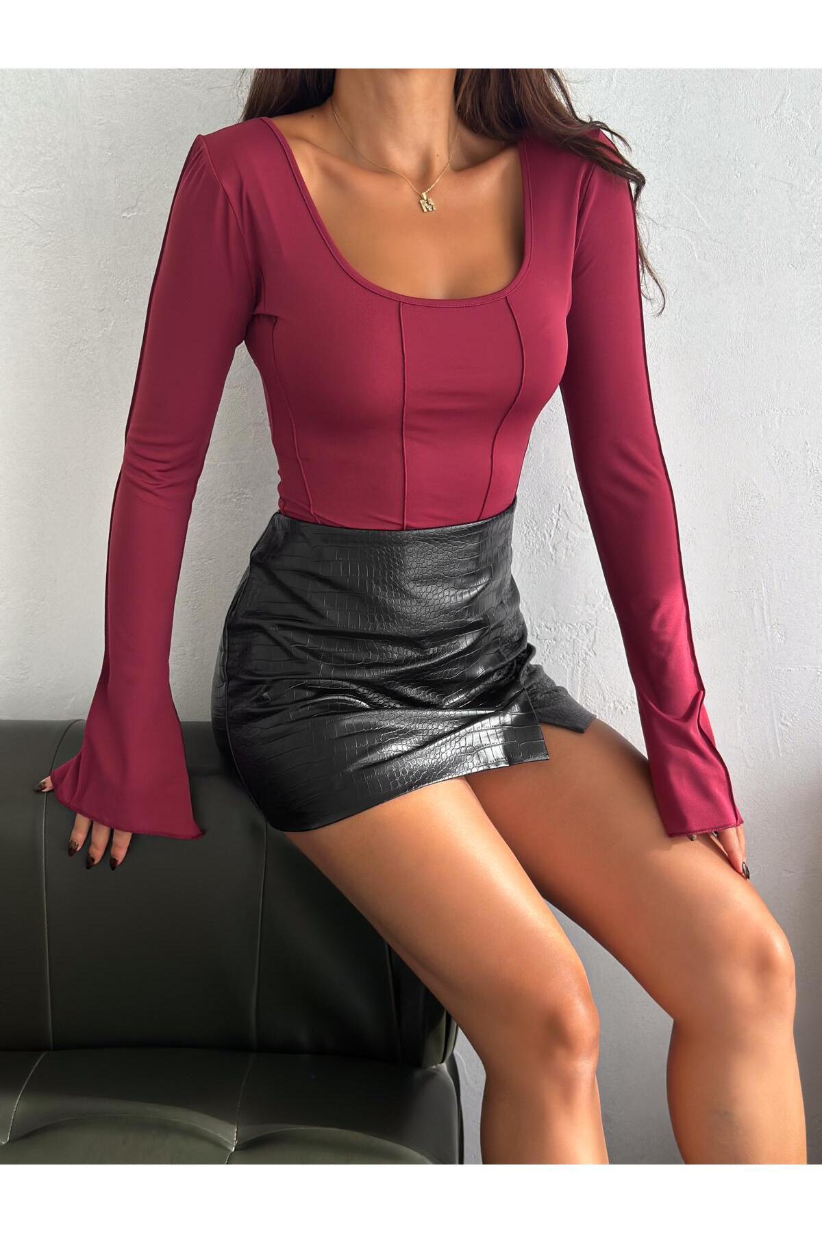 Kadın uzun kollu kare yaka kolu volanlı sırt dekolteli dikiş detaylı bluz SRA7799 Kadın uzun kollu kare yaka kolu volanlı sırt dekolteli dikiş detaylı bluz SRA7799 SRA77799 M