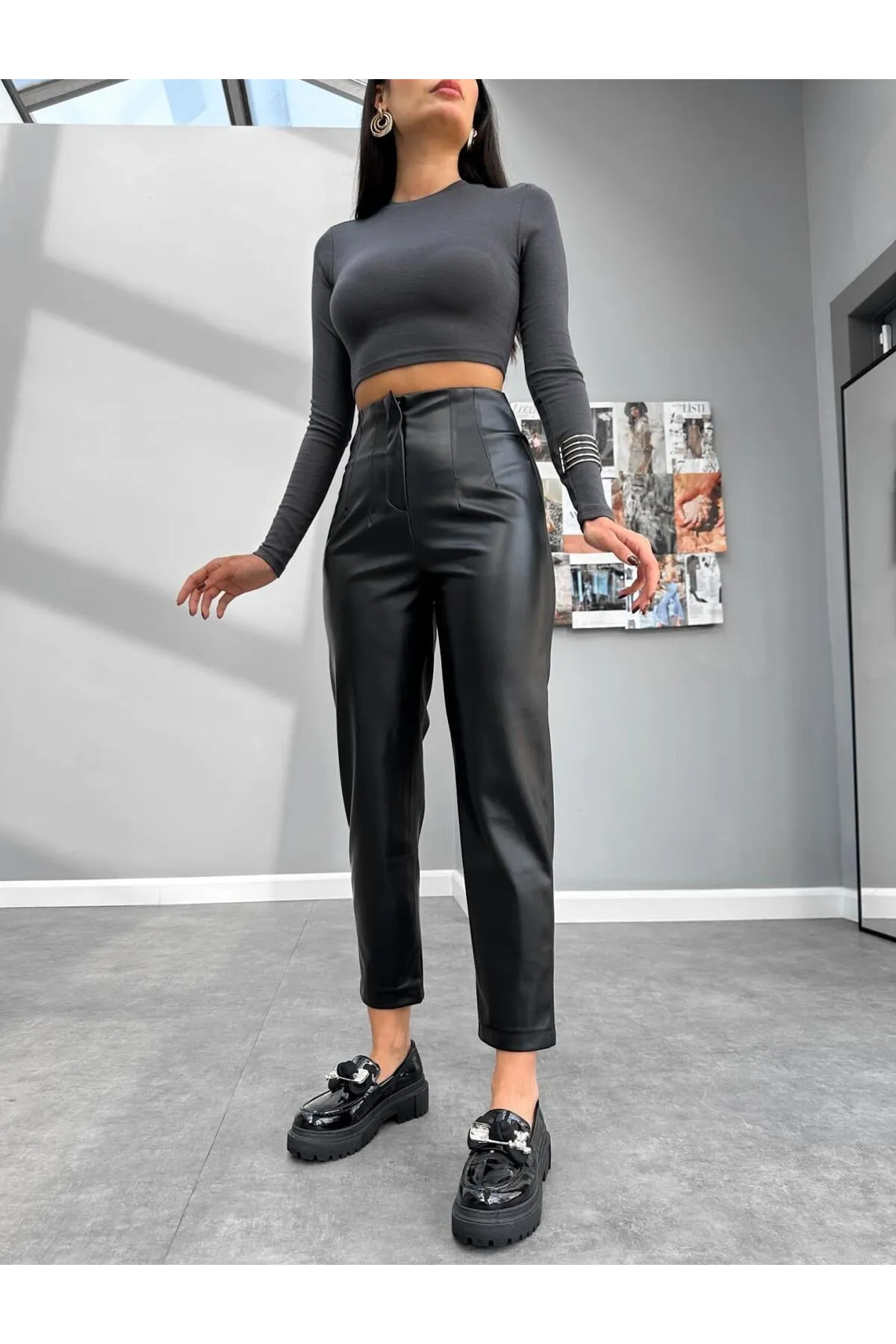 Kadın Yüksek Bel Maskülen Klasik Deri Pantolon Kemer Detaylı Havuç Model Kadın Yüksek Bel Maskülen Klasik Deri Pantolon Kemer Detaylı Havuç Model WİNPNKMR01 XL