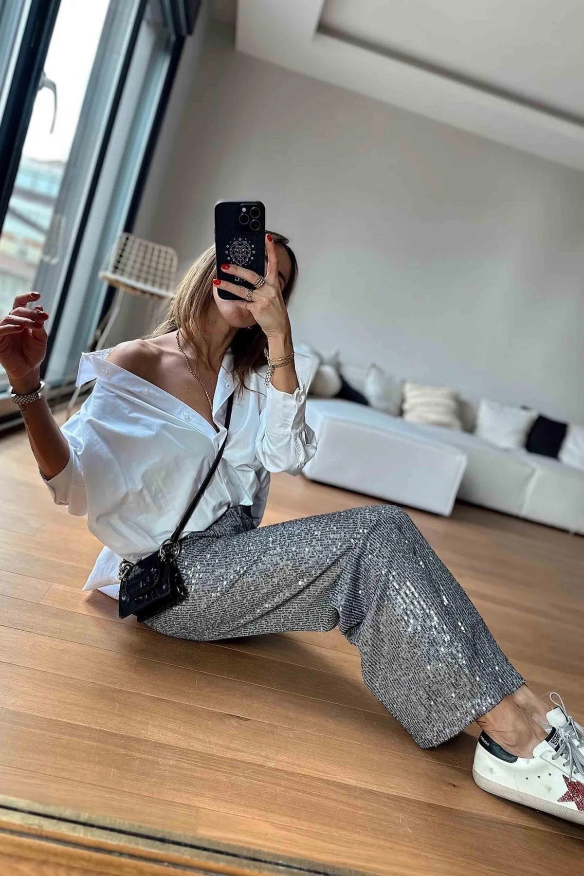 Kadın Beli Lastikli ve Pul Payetli Bol Pantolon Kadın Beli Lastikli ve Pul Payetli Bol Pantolon QAJU27553 L