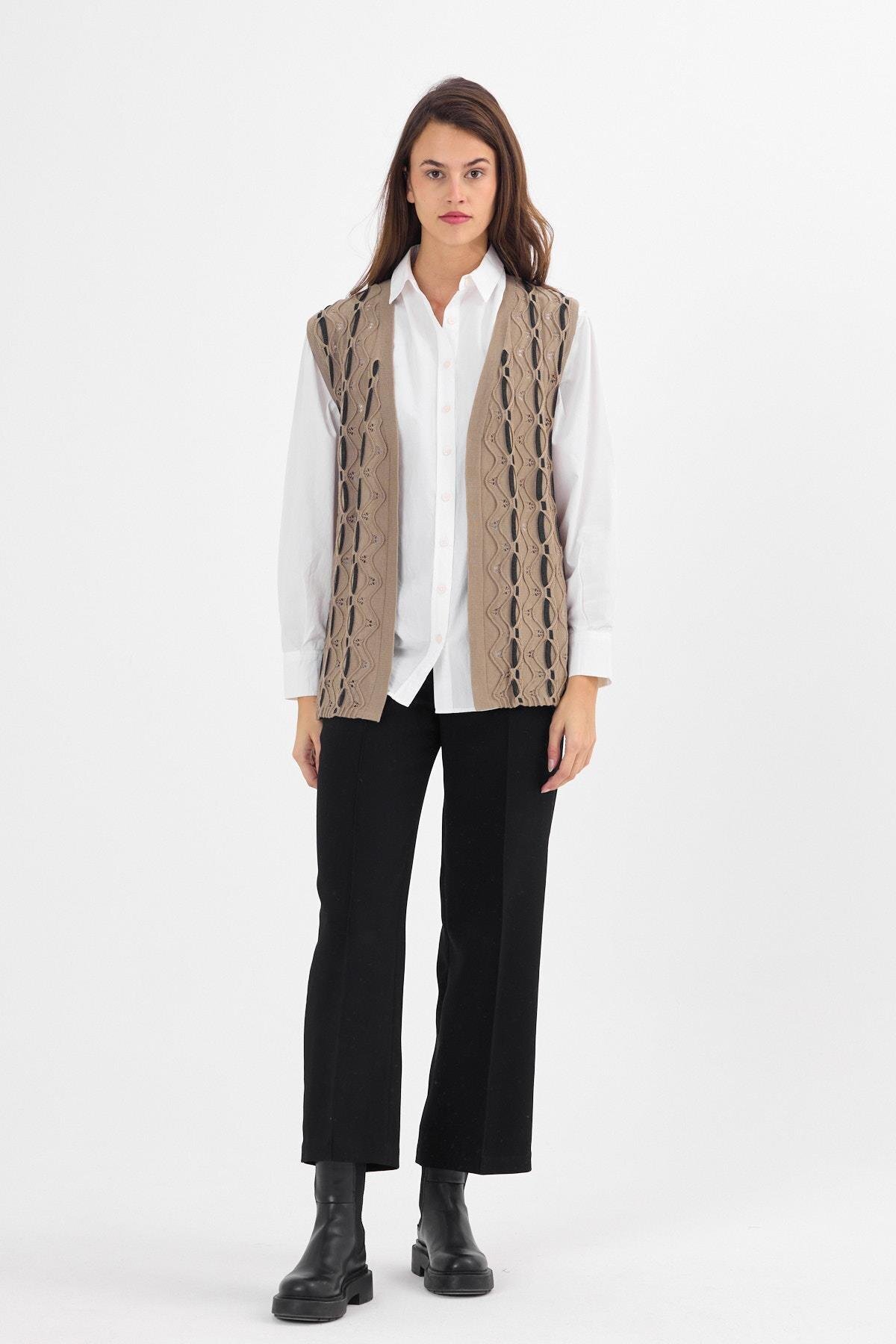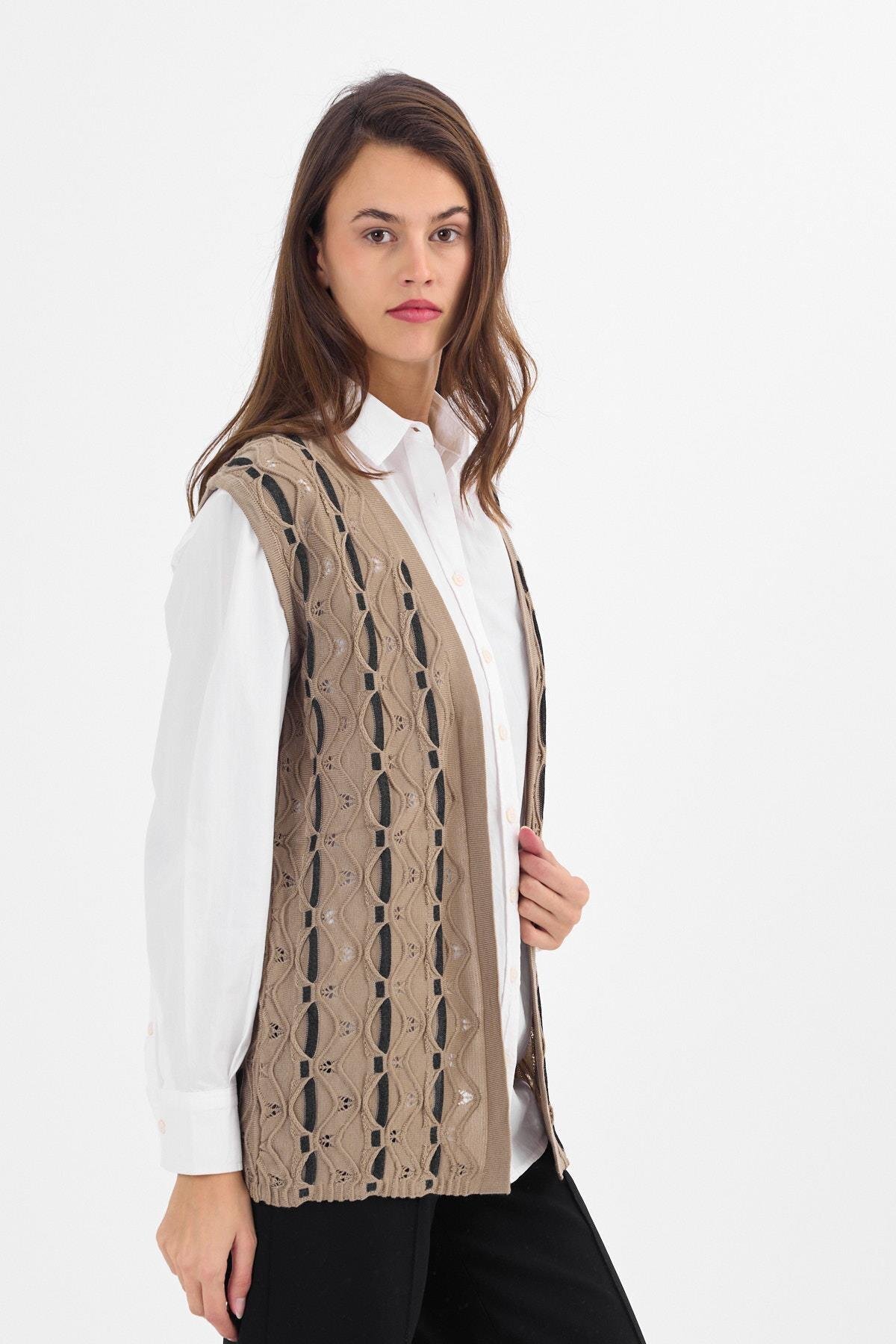 Kadın Kum Simli Burgu Desenli Mevsimlik Triko Yelek Kadın Kum Simli Burgu Desenli Mevsimlik Triko Yelek 30025 2XL