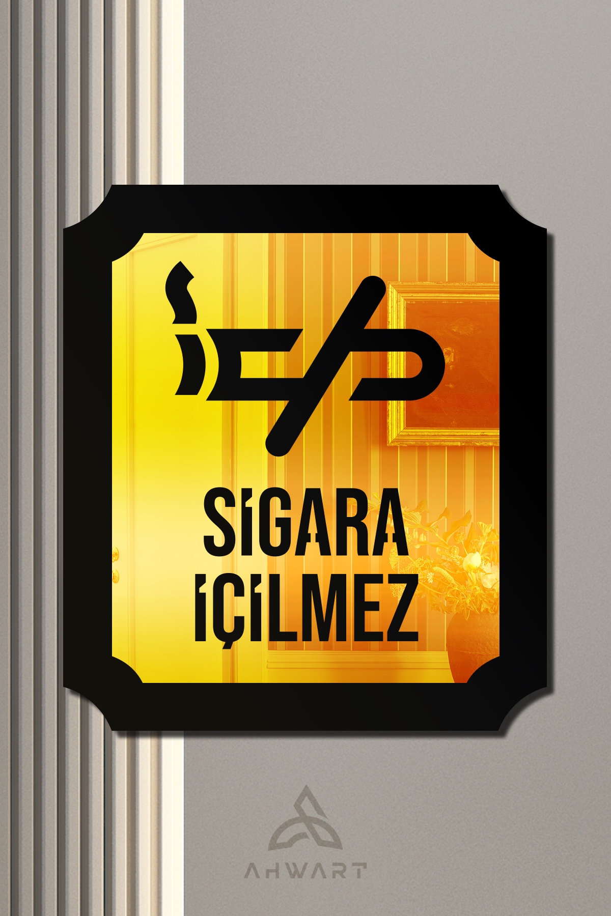 Sigara İçilmez Yazılı Dekoratif Ahşap Pleksi Gold Uyarı Levhası