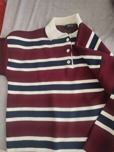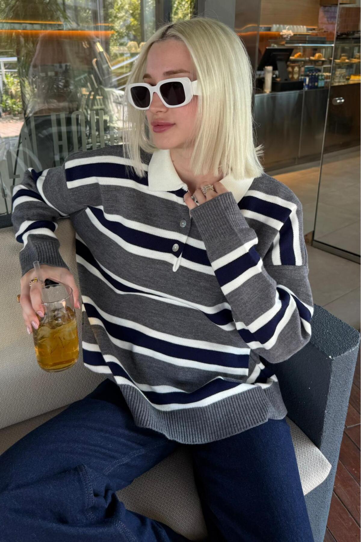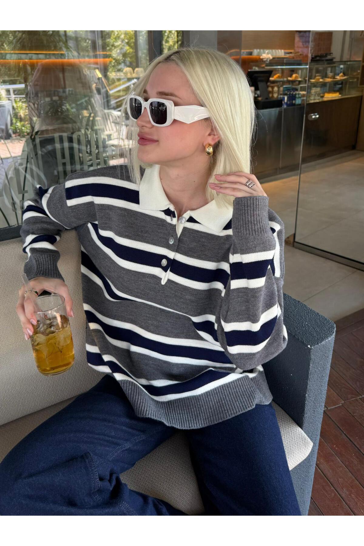 Antrasit Çizgili Düğmeli Polo Yaka Kadın Triko Kazak MG2280 Antrasit Çizgili Düğmeli Polo Yaka Kadın Triko Kazak MG2280 Standart