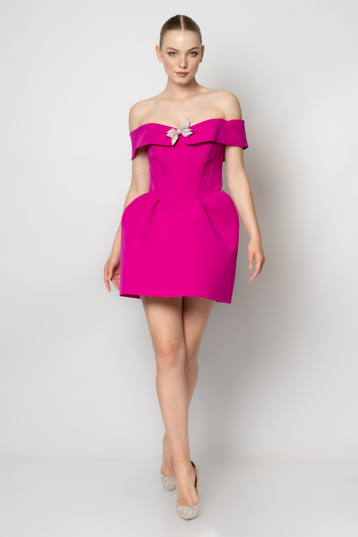 Göğsü ve beli çiçek detaylı straplez krep abiye elbise Göğsü ve beli çiçek detaylı straplez krep abiye elbise 7330 44