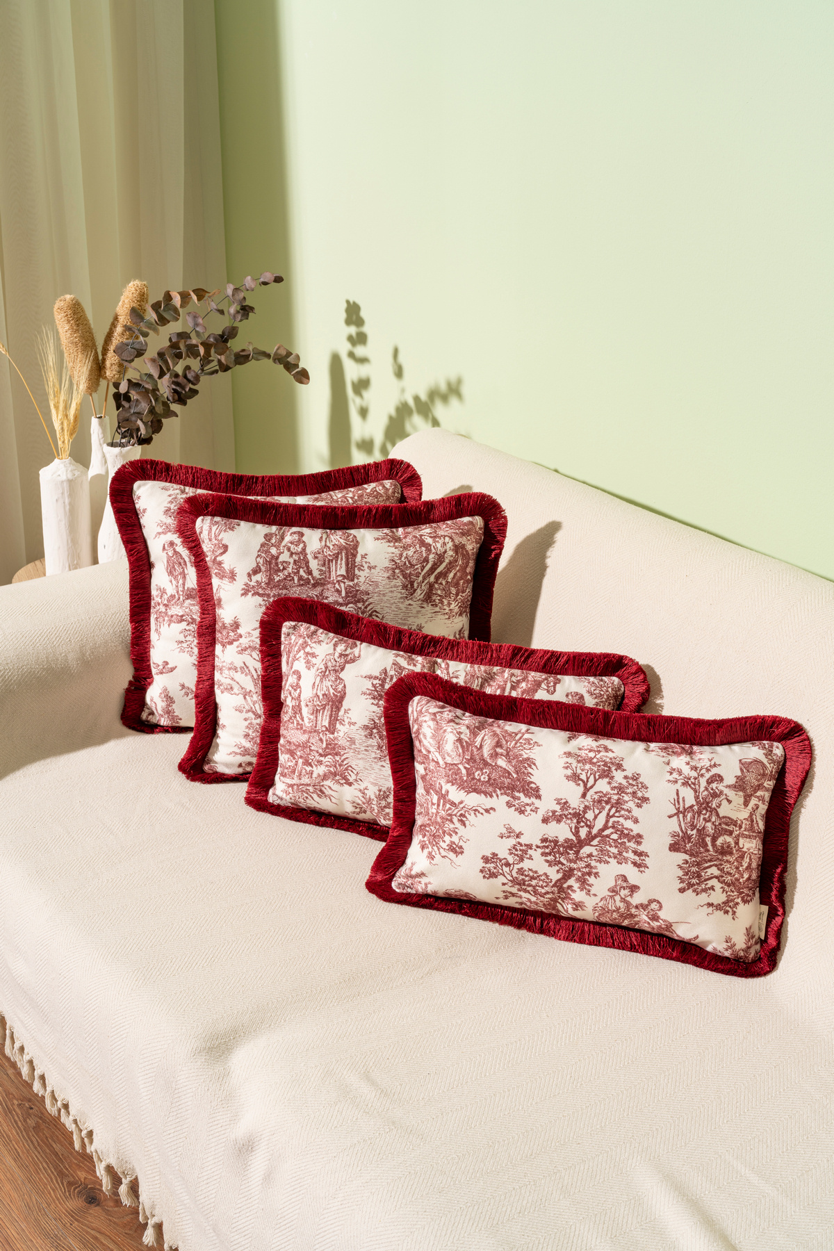 Bordo Püsküllü Ingiliz Köylüler Desenli Dekoratif 4'lü Kırlent Kılıfı Takımı Bordo Püsküllü Ingiliz Köylüler Desenli Dekoratif 4'lü Kırlent Kılıfı Takımı BPIKD00006 43 x 43